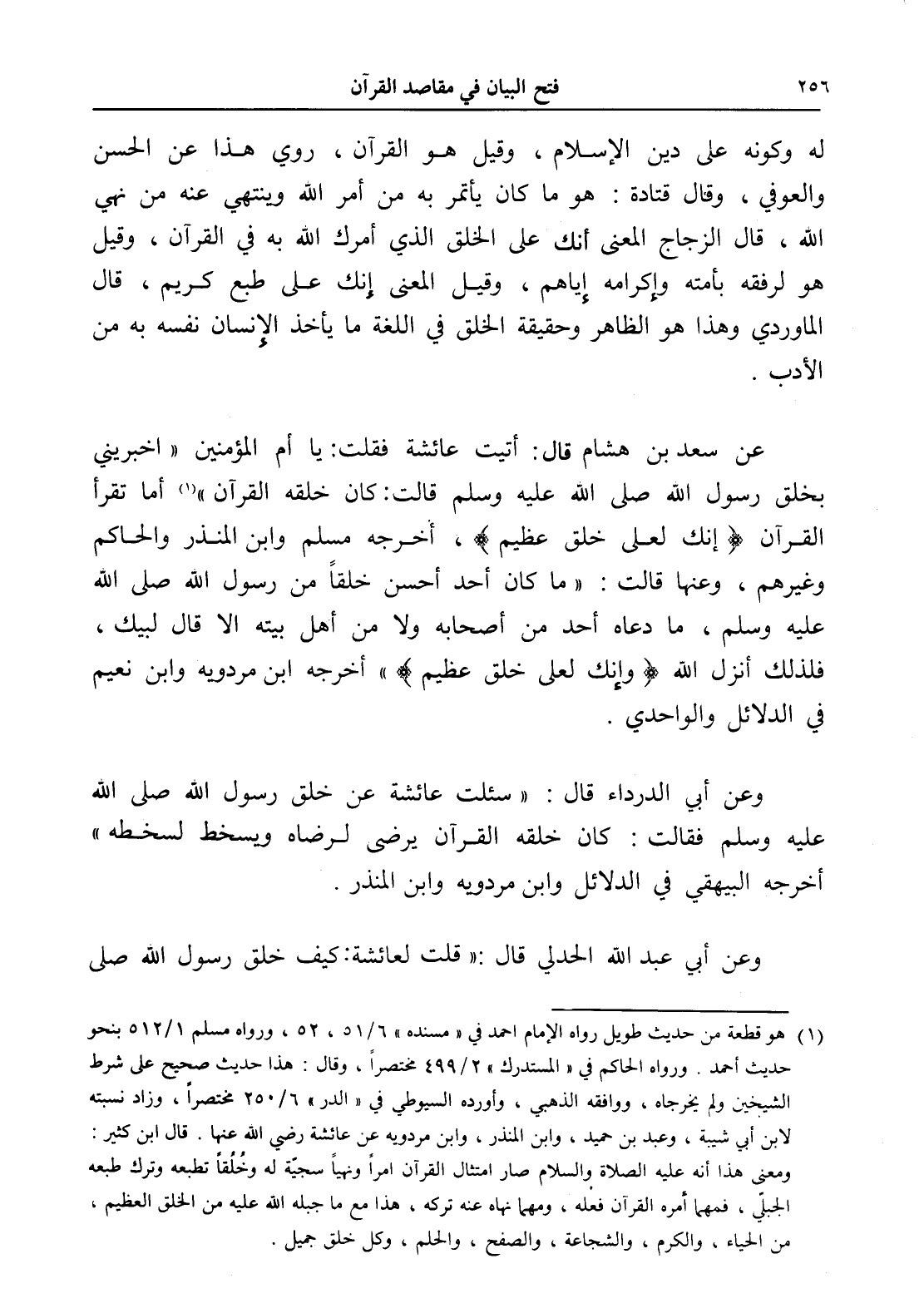 (¬1) هو قطعة من حديث طويل رواه الإمام أحمد في " مسنده " 6/ 51، 52، ورواه مسلم 1/ 512 بنحو حديث أحمد. ورواه الحاكم في " المستدرك " 2/ 499 مختصراً، وقال: هذا حديث صحيح على شرط الشيخين ولم يخرجاه، ووافقه الذهبي، وأورده السيوطي في " الدر " 6/ 250 مختصراً، وزاد نسبته لابن أبي شيبة، وعبد بن حميد، وابن المنذر، وابن مردويه عن عائشة رضي الله عنها. قال ابن كثير: ومعنى هذا أنه عليه الصلاة والسلام صار امتثال القرآن أمراً ونهياً سجية له وخُلُقاً تطبعه وترك طبعه الجبلي، فمهما أمره القرآن فعله، ومهما نهاه عنه تركه، هذا مع ما جبله الله عليه من الخلق العظيم، من الحياء، والكرم، والشجاعة، والصفح، والحلم، وكل خلق جميل.