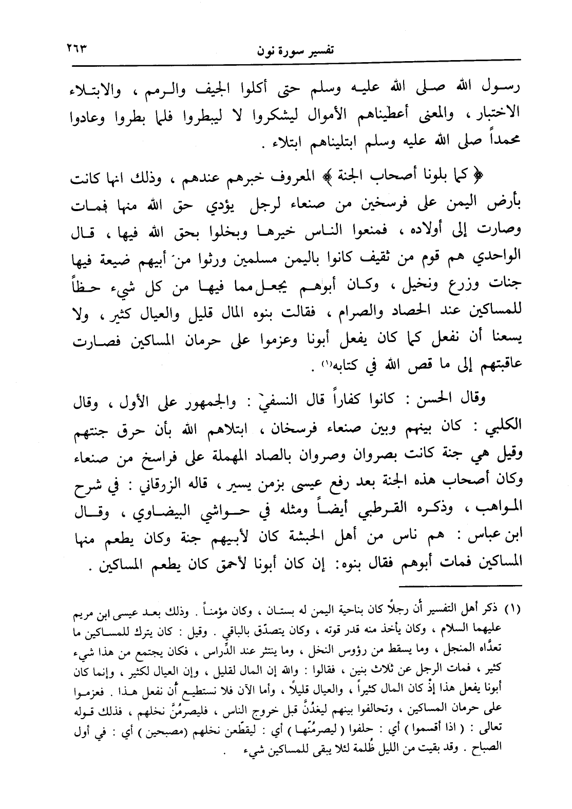وقال الحسن: كانوا كفاراً قال النسفي: والجمهور على الأول، وقال الكلبي: كان بينهم وبين صنعاء فرسخان، ابتلاهم الله بأن حرق جنتهم وقيل هي جنة كانت بصروان وصروان بالصاد المهملة على فراسخ من صنعاء وكان أصحاب هذه الجنة بعد رفع عيسى بزمن يسير، قاله الزوقاني: في شرح المواهب، وذكره القرطبي أيضاًً ومثله في حواشي البيضاوي، وقال ابن عباس: هم ناس من أهل الحبشة كان لأبيهم جنة وكان يطعم منها المساكين فمات أبوهم فقال بنوه: إن كان أبونا لأحمق كان يطعم المساكين.