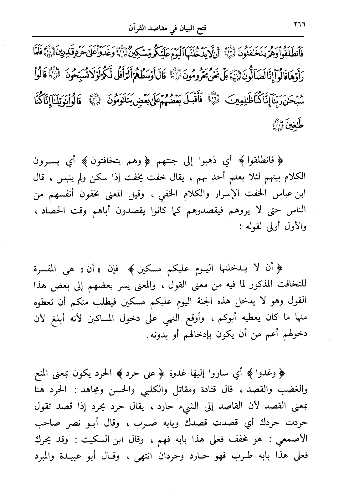 (وغدوا) أي ساروا إليها غدوة (على حرد) الحرد يكون بمعنى المنع والغضب والقصد، قال قتادة ومقاتل والكلبي والحسن ومجاهد: الحرد هنا بمعنى القصد لأن القاصد إلى الشيء حارد، يقال حرد يحرد إذا قصد تقول حردت حردك أي قصدت قصدك وبابه ضرب، وقال أبو نصر صاحب الأصمعي: هو مخفف فعلى هذا بابه فهم، وقال ابن السكيت: وقد يحرك فعلى هذا بابه طرب فهو حارد وحردان انتهى، وقال أبو عبيدة والمبرد