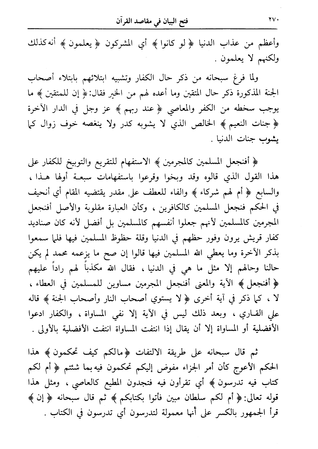 (أفنجعل المسلمين كالمجرمين) الاستفهام للتقريع والتوبيخ للكفار على هذا القول الذي قالوه وقد وبخوا وقرعوا باستفهامات سبعة أولها هذا، والسابع (أم لهم شركاء) والفاء للعطف على مقدر يقتضيه المقام أي أنحيف في الحكم فنجعل المسلمين كالكافرين، وكأن العبارة مقلوبة والأصل أفنجعل المجرمين كالمسلمين لأنهم جعلوا أنفسهم كالمسلمين بل أفضل لأنه كان صناديد كفار قريش يرون وفور حظهم في الدنيا وقلة حظوظ المسلمين فيها فلما سمعوا بذكر الآخرة وما يعطي الله المسلمين فيها قالوا إن صح ما يزعمه محمد لم يكن حالنا وحالهم إلا مثل ما هي في الدنيا، فقال الله مكذباً لهم راداً عليهم (أفنجعل) الآية والمعنى أفنجعل المجرمين مساوين للمسلمين في العطاء، لا، كما ذكر في آية أخرى (لا يستوي أصحاب النار وأصحاب الجنة) قاله علي القاري، وبعد ذلك ليس في الآية إلا نفي المساواة، والكفار ادعوا الأفضلية أو المساواة إلا أن يقال إذا انتفت المساواة انتفت الأفضلية بالأولى.