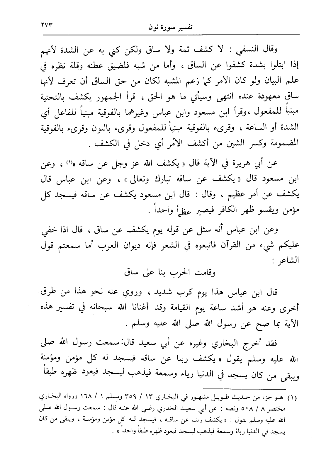 (¬1) هو جزء من حديث طويل مشهور في البخاري 13/ 359 ومسلم 1/ 168 ورواه البخاري مختصر 8/ 508 ونصه: عن أبي سعيد الخدري رضي الله عنه قال: سمعت رسول الله صلى الله عليه وسلم يقول: " يكشف ربنا عن ساقه، فيسجد له كل مؤمن ومؤمنة، ويبقى من كان يسجد في الدنيا رياءً وسمعة فيذهب ليسجد فيعود ظهره طبقاً واحداً ".