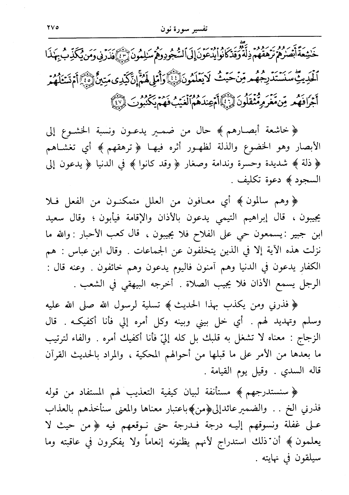 خَاشِعَةً أَبْصَارُهُمْ تَرْهَقُهُمْ ذِلَّةٌ وَقَدْ كَانُوا يُدْعَوْنَ إِلَى السُّجُودِ وَهُمْ سَالِمُونَ (43) فَذَرْنِي وَمَنْ يُكَذِّبُ بِهَذَا الْحَدِيثِ سَنَسْتَدْرِجُهُمْ مِنْ حَيْثُ لَا يَعْلَمُونَ (44) وَأُمْلِي لَهُمْ إِنَّ كَيْدِي مَتِينٌ (45) أَمْ تَسْأَلُهُمْ أَجْرًا فَهُمْ مِنْ مَغْرَمٍ مُثْقَلُونَ (46) أَمْ عِنْدَهُمُ الْغَيْبُ فَهُمْ يَكْتُبُونَ (47)