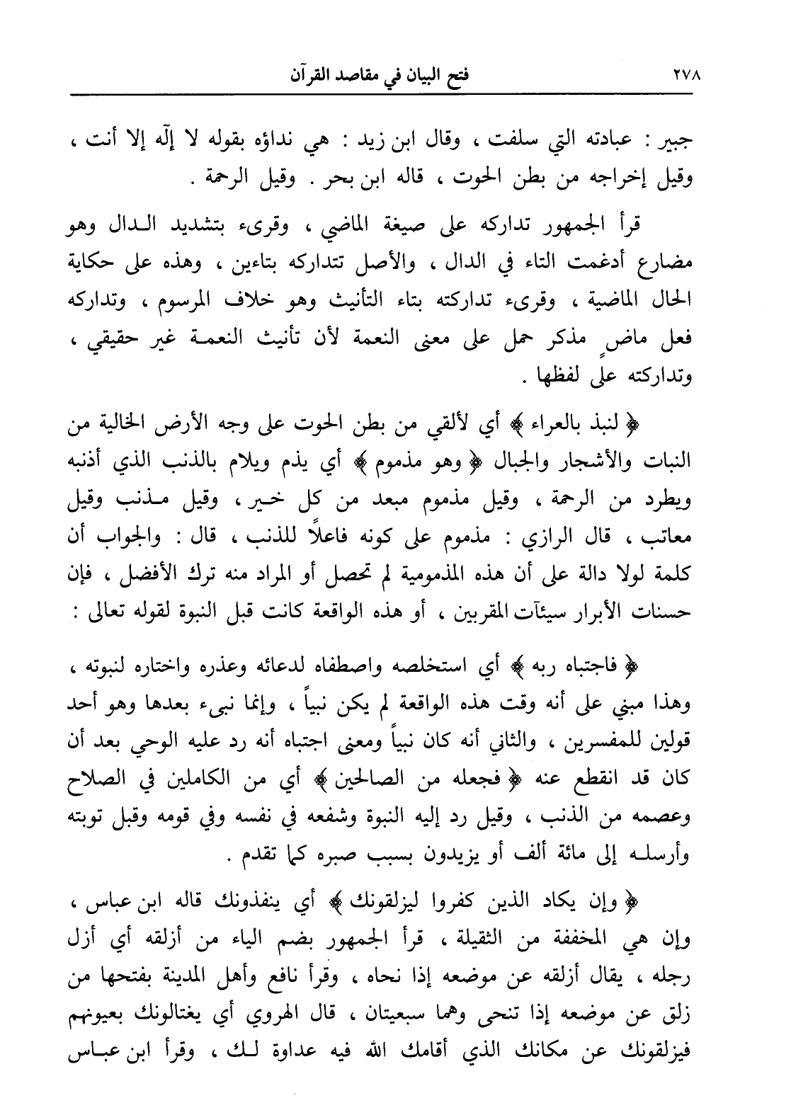 (لنبذ بالعراء) أي لألقي من بطن الحوت على وجه الأرض الخالية من النبات والأشجار والجبال (وهو مذموم) أي يذم ويلام بالذنب الذي أذنبه ويطرد من الرحمة، وقيل مذموم مبعد من كل خير، وقيل مذنب وقيل معاتب، قال الرازي: مذموم على كونه فاعلاً للذنب، قال: والجواب أن كلمة لولا دالة على أن هذه المذمومية لم تحصل أو المراد منه ترك الأفضل، فإن حسنات الأبرار سيئات المقربين، أو هذه الواقعة كانت قبل النبوة لقوله تعالى: