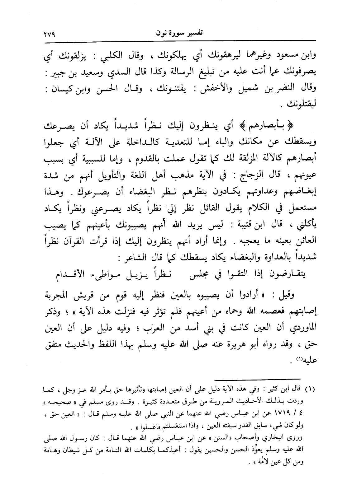 (¬1) قال ابن كثير: وفي هذه الآية دليل على أن العين إصابتها وتأثيرها حق بأمر الله عز وجل، كما وردت بذلك الأحاديث المروية من طرق متعددة كثيرة. وقد روى مسلم في " صحيحه " 4/ 1719 عن ابن عباس رضي الله عنهما عن النبي صلى الله عليه وسلم قال: " العين حق، ولو كان شيء سابق القدر سبقته العين، وإذا استغسلتم فاغسلوا ".