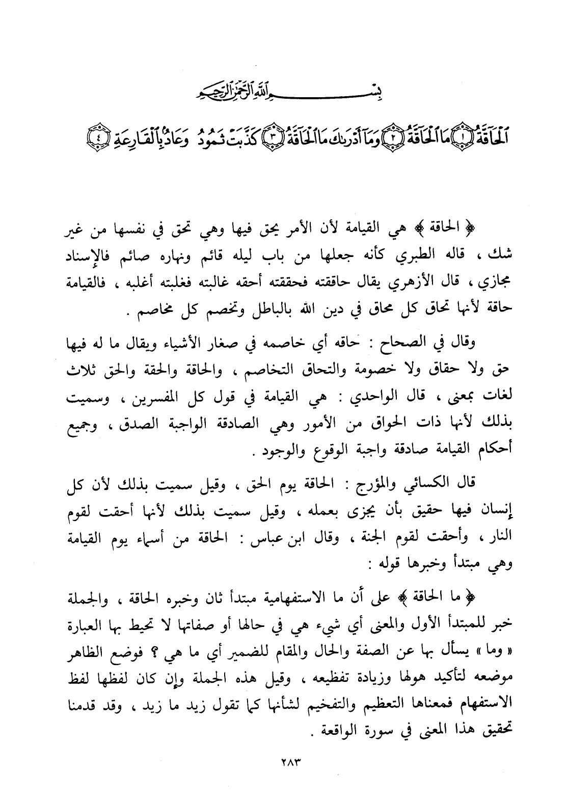 (الْحَاقَّةُ) هي القيامة لأن الأمر يحق فيها وهي تحق في نفسها من غير شك، قاله الطبري كأنه جعلها من باب ليله قائم ونهاره صائم فالإسناد مجازي، قال الأزهري يقال حاققته فحققته أحقه غالبته فغلبته أغلبه، فالقيامة حاقة لأنها تحاق كل محاق في دين الله بالباطل وتخصم كل مخاصم.