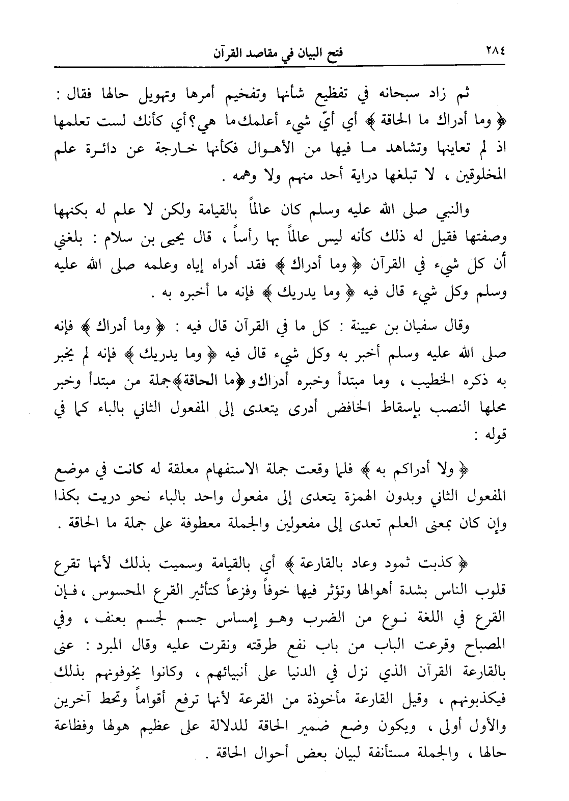 وقال سفيان بن عيينة: كل ما في القرآن قال فيه: (وما أدراك) فإنه صلى الله عليه وسلم أخبر به وكل شيء قال فيه (وما يدريك) فإنه لم يخبر به ذكره الخطيب، وما مبتدأ وخبره أدراك و (ما الحاقة) جملة من مبتدأ وخبر محلها النصب بإسقاط الخافض أدرى يتعدى إلى المفعول الثاني بالباء كما في قوله: