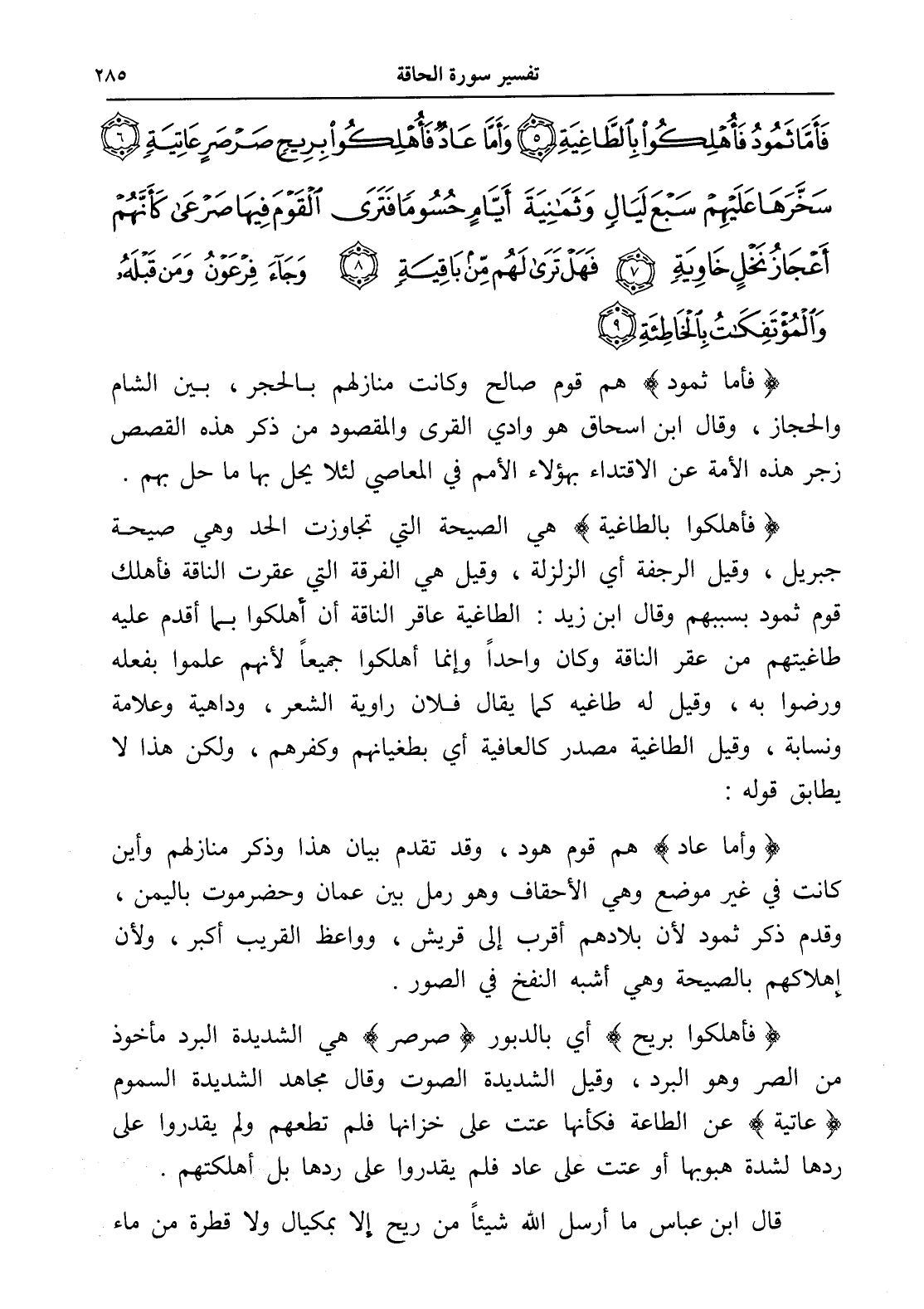 (فأهلكوا بالطاغية) هي الصيحة التي تجاوزت الحد وهي صيحة جبريل، وقيل الرجفة أي الزلزلة، وقيل هي الفرقة التي عقرت الناقة فأهلك قوم ثمود بسببهم وقال ابن زيد: الطاغية عاقر الناقة أن أهلكوا بما أقدم عليه طاغيتهم من عقر الناقة وكان واحداً وإنما أهلكوا جميعاً لأنهم علموا بفعله ورضوا به، وقيل له طاغيه كما يقال فلان راوية الشعر، وداهية وعلامة ونسابة، وقيل الطاغية مصدر كالعافية أي بطغيانهم وكفرهم، ولكن هذا لا يطابق قوله: