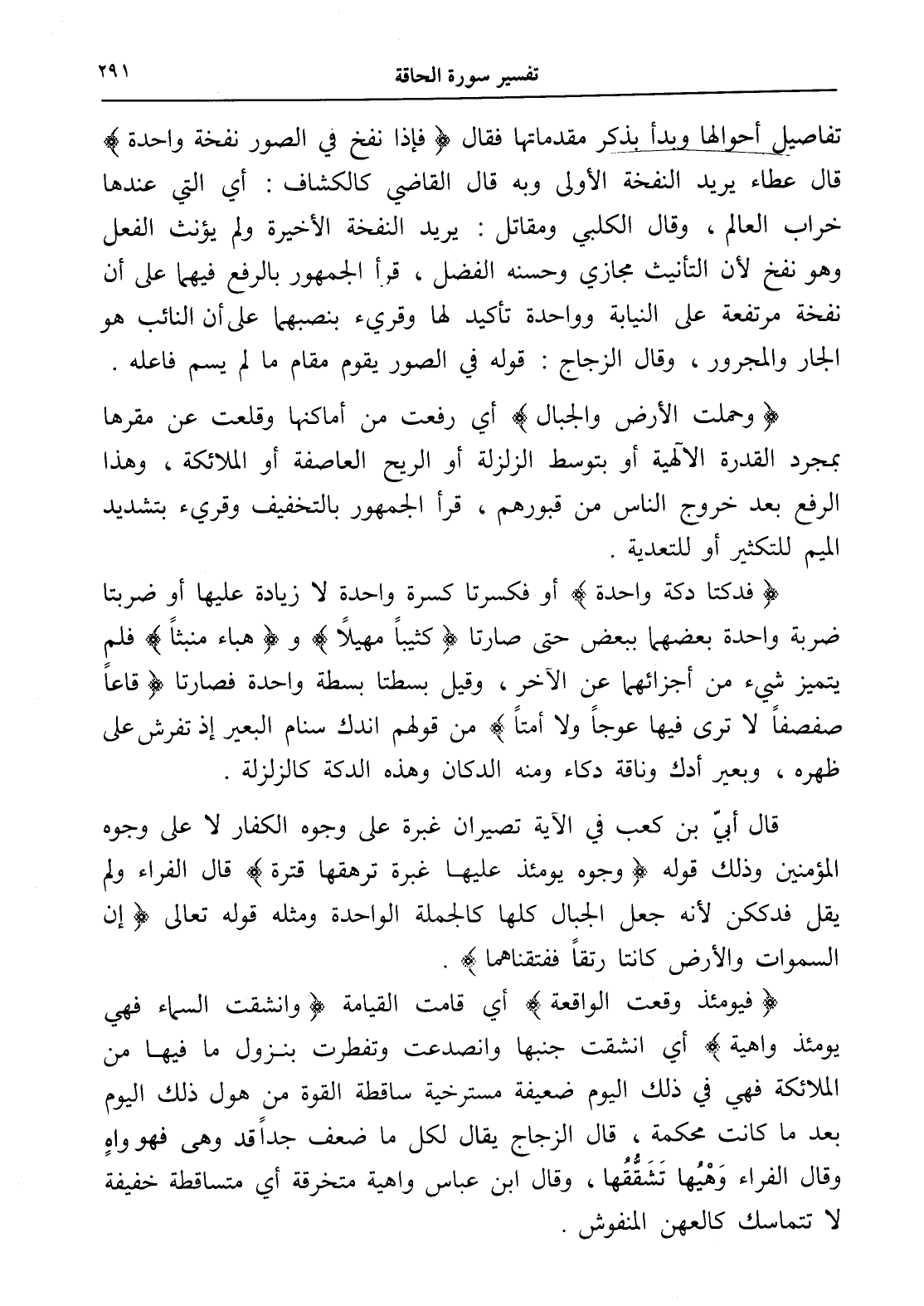(فإذا نفخ في الصور نفخة واحدة) قال عطاء يريد النفخة الأولى وبه قال القاضي كالكشاف: أي التي عندها خراب العالم، وقال الكلبي ومقاتل: يريد النفخة الأخيرة ولم يؤنث الفعل وهو نفخ لأن التأنيث مجازي وحسنه الفضل، قرأ الجمهور بالرفع فيهما على أن نفخة مرتفعة على النيابة وواحدة تأكيد لها وقريء بنصبهما على أن النائب هو الجار والمجرور، وقال الزجاج: قوله في الصور يقوم مقام ما لم يسم فاعله.