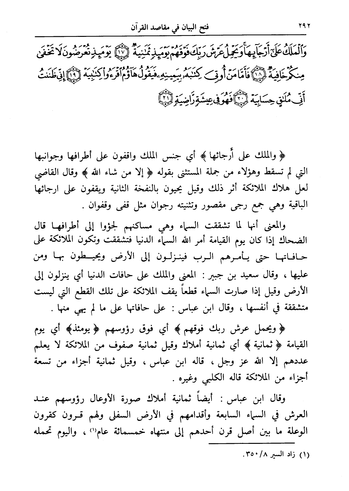 وَالْمَلَكُ عَلَى أَرْجَائِهَا وَيَحْمِلُ عَرْشَ رَبِّكَ فَوْقَهُمْ يَوْمَئِذٍ ثَمَانِيَةٌ (17) يَوْمَئِذٍ تُعْرَضُونَ لَا تَخْفَى مِنْكُمْ خَافِيَةٌ (18) فَأَمَّا مَنْ أُوتِيَ كِتَابَهُ بِيَمِينِهِ فَيَقُولُ هَاؤُمُ اقْرَءُوا كِتَابِيَهْ (19) إِنِّي ظَنَنْتُ أَنِّي مُلَاقٍ حِسَابِيَهْ (20) فَهُوَ فِي عِيشَةٍ رَاضِيَةٍ (21)