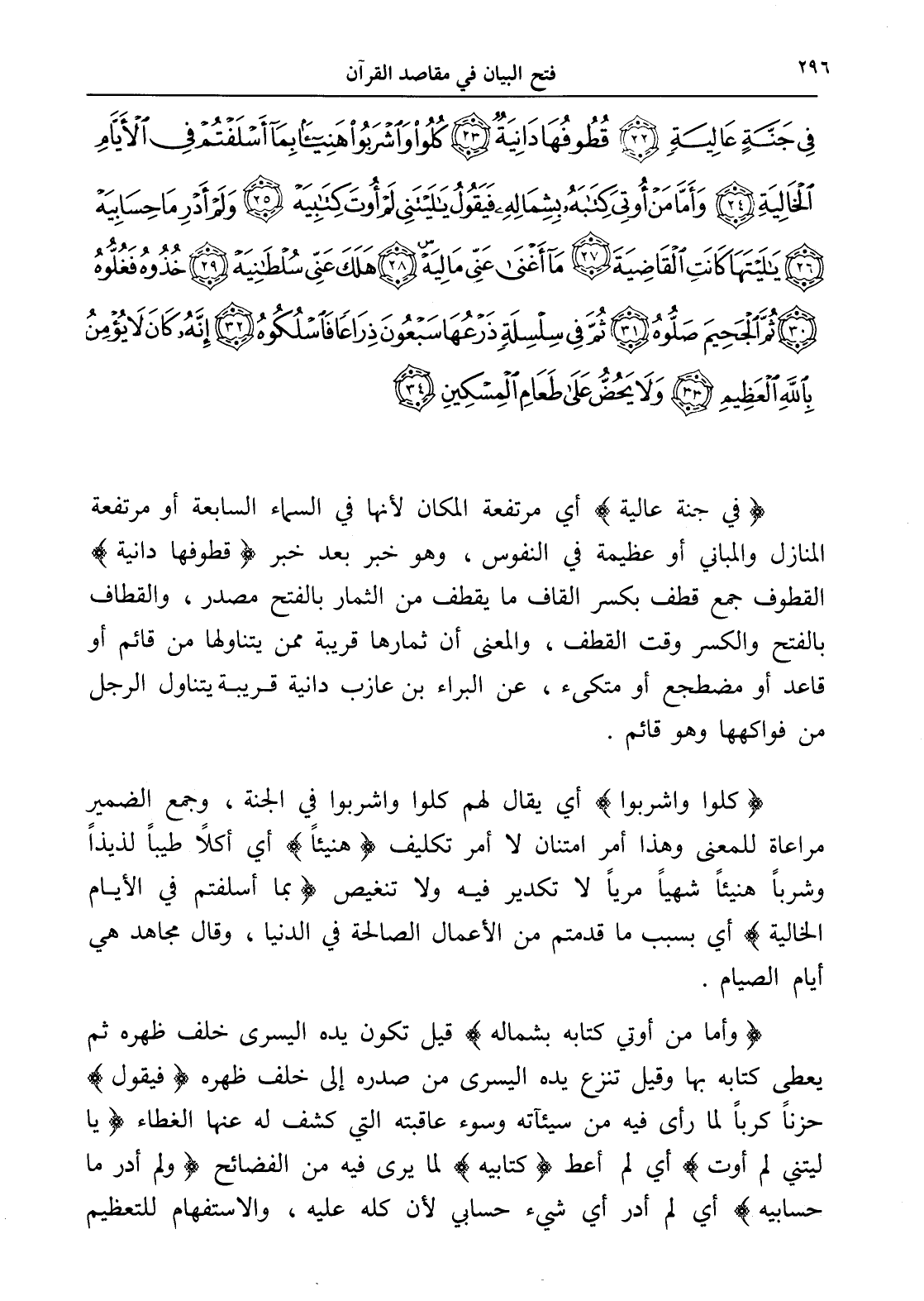 فِي جَنَّةٍ عَالِيَةٍ (22) قُطُوفُهَا دَانِيَةٌ (23) كُلُوا وَاشْرَبُوا هَنِيئًا بِمَا أَسْلَفْتُمْ فِي الْأَيَّامِ الْخَالِيَةِ (24) وَأَمَّا مَنْ أُوتِيَ كِتَابَهُ بِشِمَالِهِ فَيَقُولُ يَا لَيْتَنِي لَمْ أُوتَ كِتَابِيَهْ (25) وَلَمْ أَدْرِ مَا حِسَابِيَهْ (26) يَا لَيْتَهَا كَانَتِ الْقَاضِيَةَ (27) مَا أَغْنَى عَنِّي مَالِيَهْ (28) هَلَكَ عَنِّي سُلْطَانِيَهْ (29) خُذُوهُ فَغُلُّوهُ (30) ثُمَّ الْجَحِيمَ صَلُّوهُ (31) ثُمَّ فِي سِلْسِلَةٍ ذَرْعُهَا سَبْعُونَ ذِرَاعًا فَاسْلُكُوهُ (32) إِنَّهُ كَانَ لَا يُؤْمِنُ بِاللَّهِ الْعَظِيمِ (33) وَلَا يَحُضُّ عَلَى طَعَامِ الْمِسْكِينِ (34)