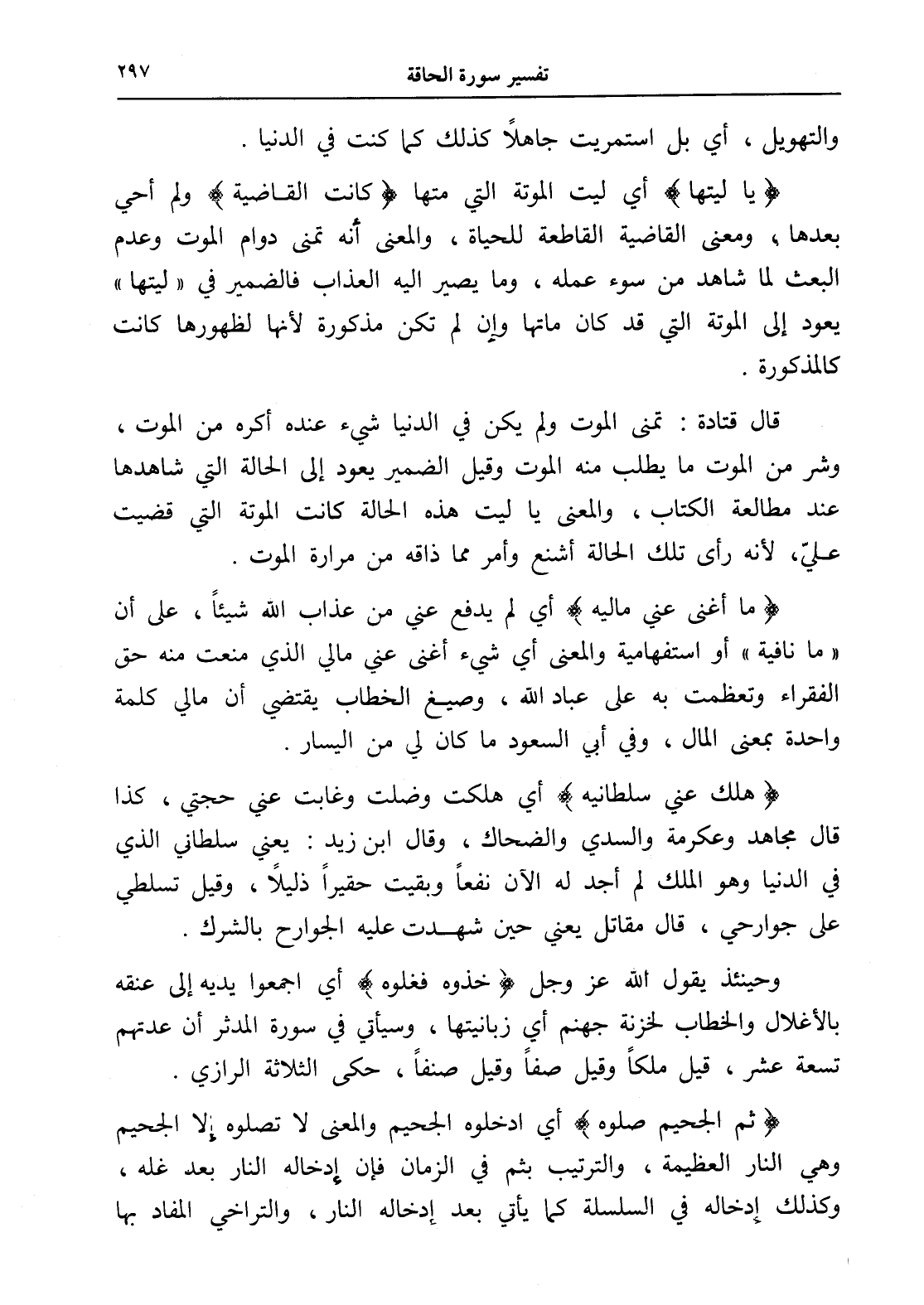 (هلك عني سلطانيه) أي هلكت وضلت وغابت عني حجتي، كذا قال مجاهد وعكرمة والسدي والضحاك، وقال ابن زيد: يعني سلطاني الذي في الدنيا وهو الملك لم أجد له الآن نفعاً وبقيت حقيراً ذليلاً، وقيل تسلطي على جوارحي، قال مقاتل يعني حين شهدت عليه الجوارح بالشرك.