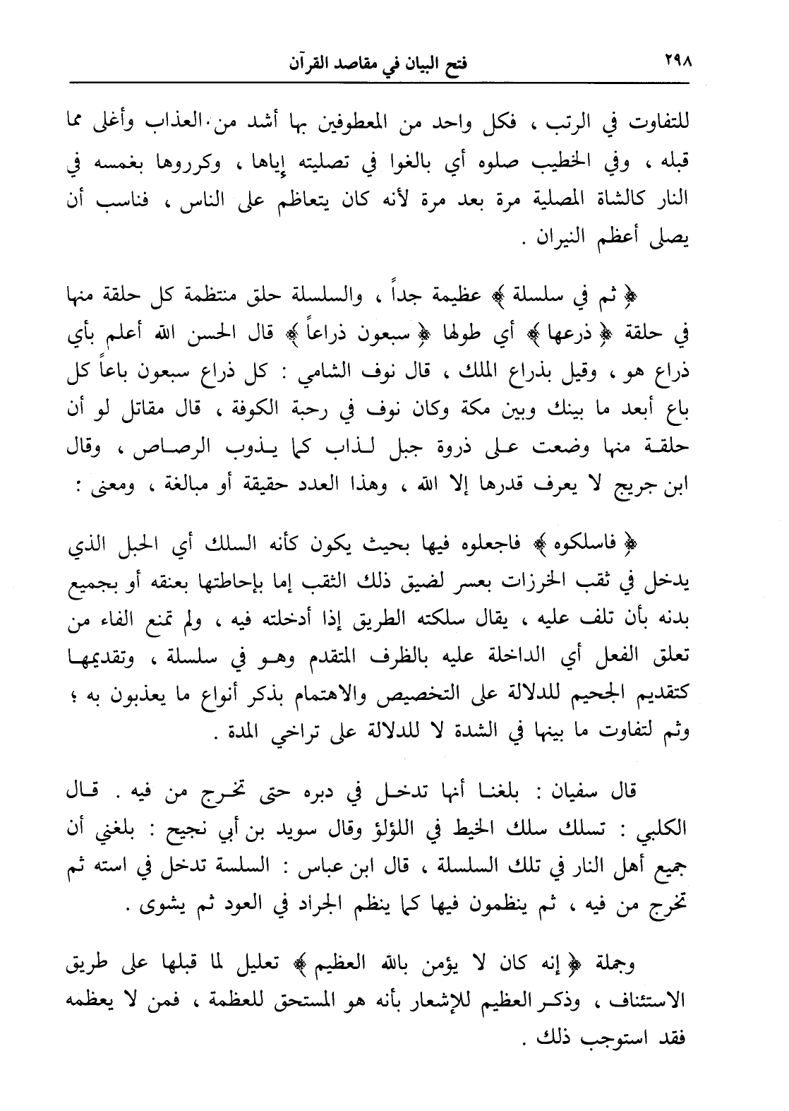 قال سفيان: بلغنا أنها تدخل في دبره حتى تخرج من فيه. قال الكلبي: تسلك سلك الخيط في اللؤلؤ وقال سويد بن أبي نجيح: بلغني أن جميع أهل النار في تلك السلسلة، قال ابن عباس: السلسة تدخل في استه ثم تخرج من فيه، ثم ينظمون فيها كما ينظم الجراد في العود ثم يشوى.