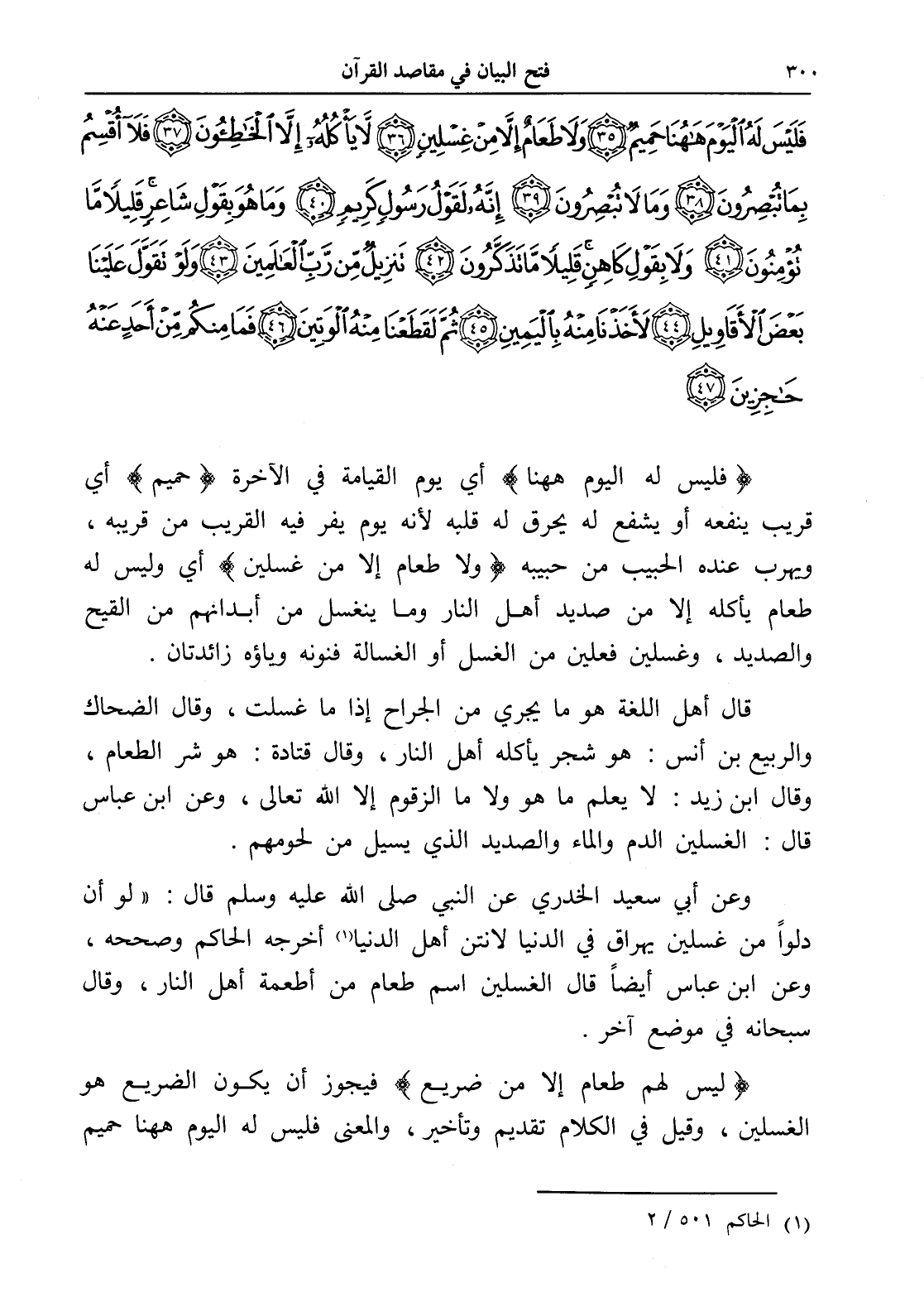 فَلَيْسَ لَهُ الْيَوْمَ هَاهُنَا حَمِيمٌ (35) وَلَا طَعَامٌ إِلَّا مِنْ غِسْلِينٍ (36) لَا يَأْكُلُهُ إِلَّا الْخَاطِئُونَ (37) فَلَا أُقْسِمُ بِمَا تُبْصِرُونَ (38) وَمَا لَا تُبْصِرُونَ (39) إِنَّهُ لَقَوْلُ رَسُولٍ كَرِيمٍ (40) وَمَا هُوَ بِقَوْلِ شَاعِرٍ قَلِيلًا مَا تُؤْمِنُونَ (41) وَلَا بِقَوْلِ كَاهِنٍ قَلِيلًا مَا تَذَكَّرُونَ (42) تَنْزِيلٌ مِنْ رَبِّ الْعَالَمِينَ (43) وَلَوْ تَقَوَّلَ عَلَيْنَا بَعْضَ الْأَقَاوِيلِ (44) لَأَخَذْنَا مِنْهُ بِالْيَمِينِ (45) ثُمَّ لَقَطَعْنَا مِنْهُ الْوَتِينَ (46) فَمَا مِنْكُمْ مِنْ أَحَدٍ عَنْهُ حَاجِزِينَ (47)