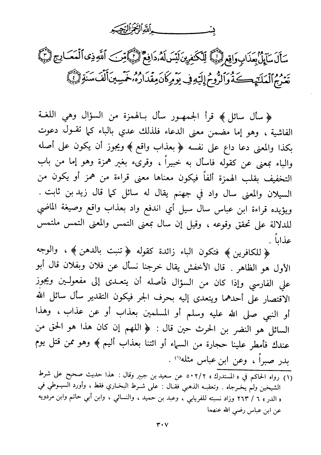 (سَأَلَ سَائِلٌ) قرأ الجمهور سأل بالهمزة من السؤال وهي اللغة الفاشية، وهو إما مضمن معنى الدعاء فلذلك عدي بالباء كما تقول دعوت بكذا والمعنى دعا داع على نفسه (بعذاب واقع) ويجوز أن يكون على أصله والباء بمعنى عن كقوله فاسأل به خبيراً، وقرىء بغير همزة وهو إما من باب التخفيف بقلب الهمزة ألفاً فيكون معناها معنى قراءة من همز أو يكون من السيلان والمعنى سأل واد في جهنم يقال له سائل كما قال زيد بن ثابت.