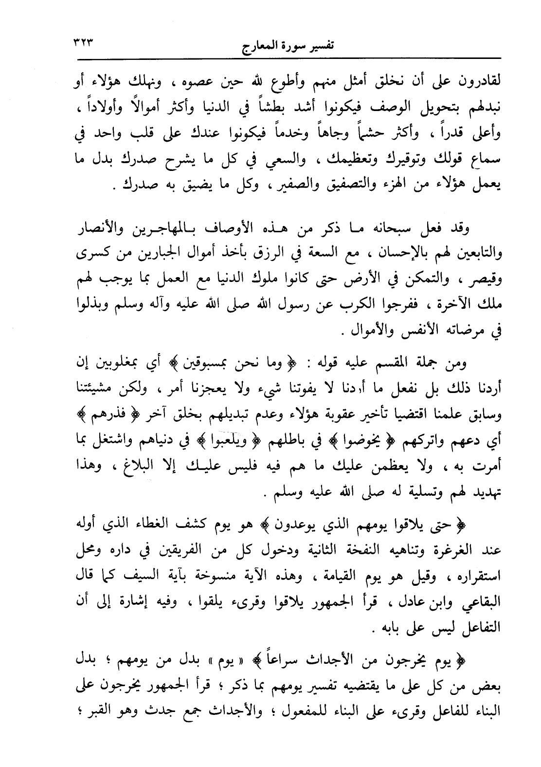 ومن جملة المقسم عليه قوله: (وما نحن بمسبوقين) أي بمغلوبين إن أردنا ذلك بل نفعل ما أردنا لا يفوتنا شيء ولا يعجزنا أمر، ولكن مشيئتنا وسابق علمنا اقتضيا تأخير عقوبة هؤلاء وعدم تبديلهم بخلق آخر