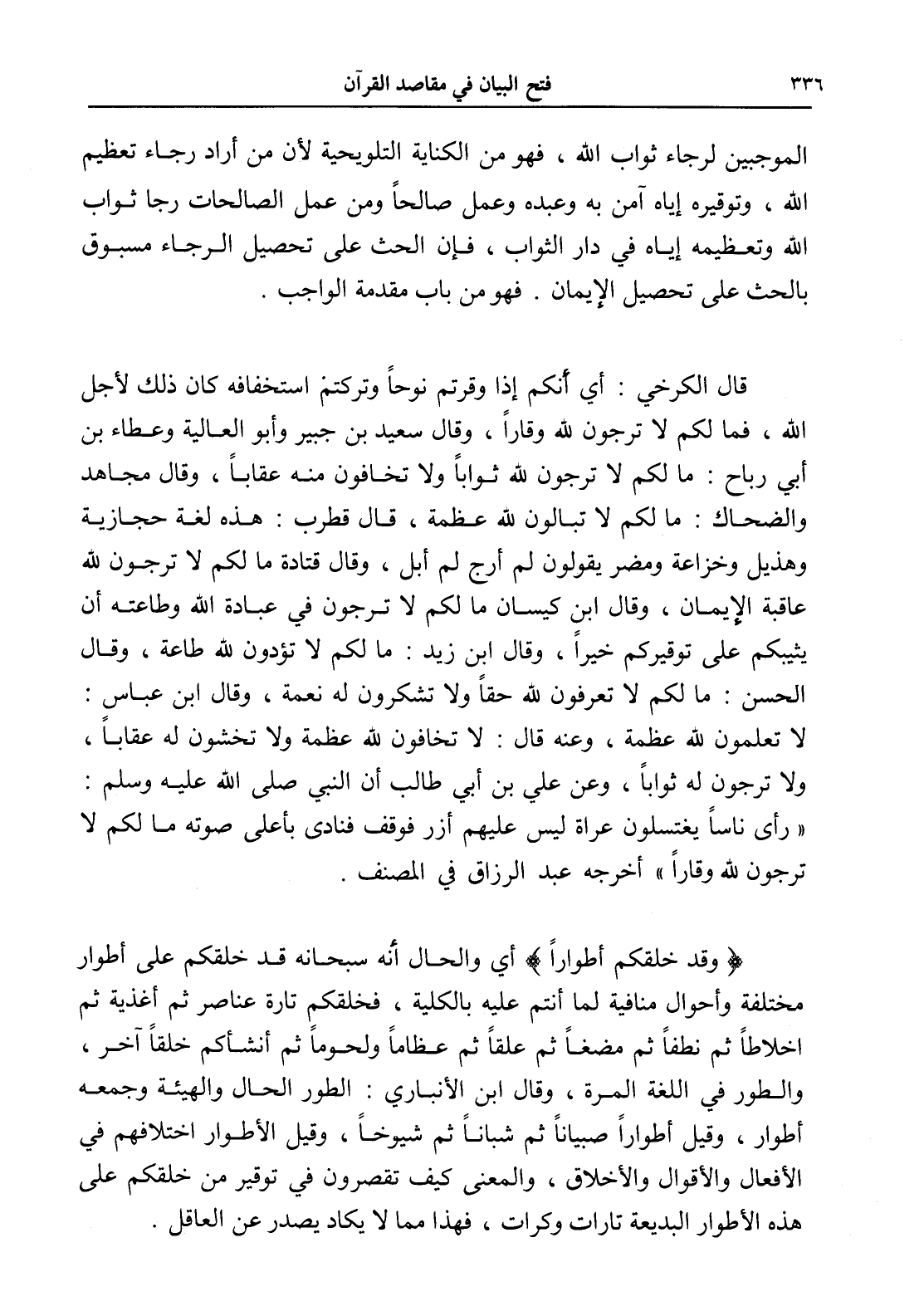 قال الكرخي: أي أنكم إذا وقرتم نوحاً وتركتم استخفافه كان ذلك لأجل الله، فما لكم لا ترجون لله وقاراً، وقال سعيد بن جبير وأبو العالية وعطاء بن أبي رباح: ما لكم لا ترجون لله ثواباً ولا تخافون منه عقاباً، وقال مجاهد والضحاك: ما لكم لا تبالون لله عظمة، قال قطرب: هذه لغة حجازية وهذيل وخزاعة ومضر يقولون لم أرج لم أبل، وقال قتادة ما لكم لا ترجون لله عاقبة الإيمان، وقال ابن كيسان ما لكم لا ترجون في عبادة الله وطاعته أن يثيبكم على توقيركم خيراً، وقال ابن زيد: ما لكم لا تؤدون لله طاعة، وقال الحسن: ما لكم لا تعرفون لله حقاً ولا تشكرون له نعمة، وقال ابن عباس: لا تعلمون لله عظمة، وعنه قال: لا تخافون لله عظمة ولا تخشون له عقاباً، ولا ترجون له ثواباً، وعن علي بن أبي طالب أن النبي صلى الله عليه وسلم: " رأى ناساً يغتسلون عراة ليس عليهم أزر فوقف فنادى بأعلى صوته ما لكم لا ترجون لله وقاراً " أخرجه عبد الرزاق في المصنف.