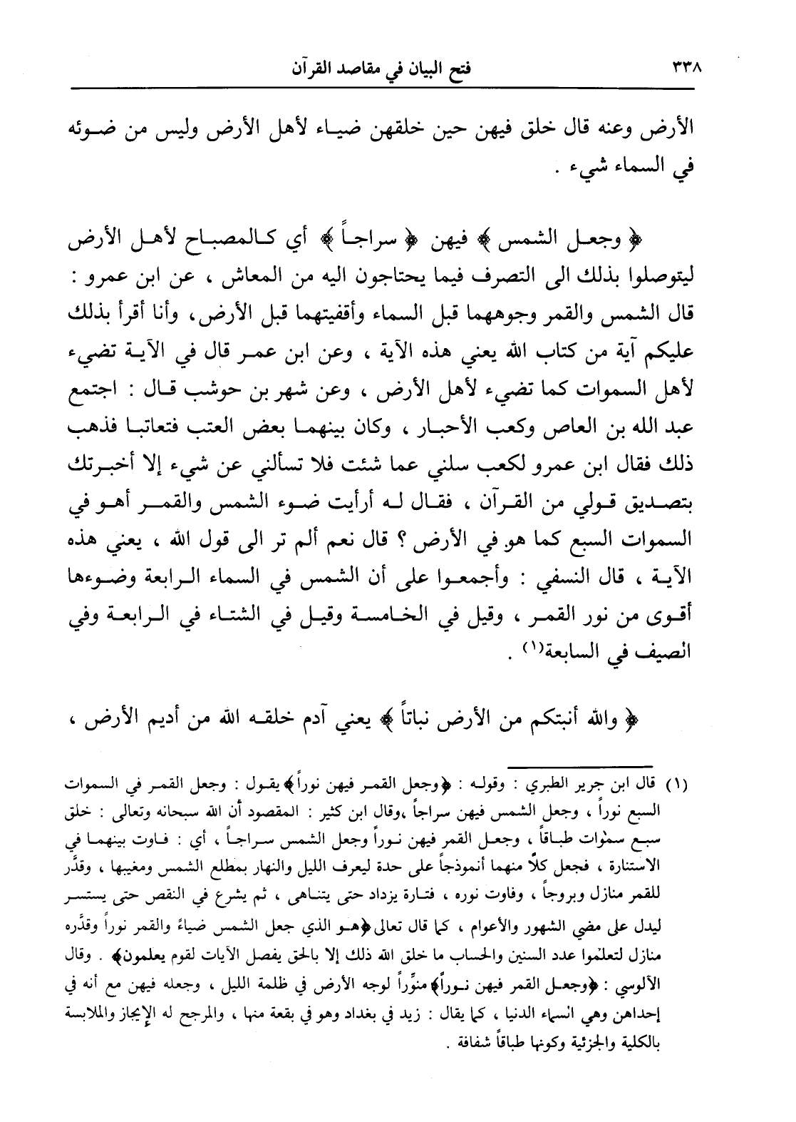 (¬1) قال ابن جرير الطبري: وقوله: (وجعل القمر فيهن نوراً) يقول: وجعل القمر في السموات السبع نوراً، وجعل الشمس فيهن سراجاً، وقال ابن كثير: المقصود أن الله سبحانه وتعالى: خلق سبع سموات طباقاً، وجعل القمر فيهن نوراً وجعل الشمس سراجاً، أي: فاوت بينهما في الاستنارة، فجعل كلاً منهما أنموذجاً على حدة ليعرف الليل والنهار بمطلع الشصر ومغيبها، وقدَّر للقمر منازل وبروجاً، وفاوت نوره، فتارة يزداد حتى يتناهى، ثم يشرع في النقص حتى يستسر ليدل على مضي الشهور والأعوام، كما قال تعالى (هُوَ الَّذِي جَعَلَ الشَّمْسَ ضِيَاءً وَالْقَمَرَ نُورًا وَقَدَّرَهُ مَنَازِلَ لِتَعْلَمُوا عَدَدَ السِّنِينَ وَالْحِسَابَ مَا خَلَقَ اللَّهُ ذَلِكَ إِلَّا بِالْحَقِّ يُفَصِّلُ الْآيَاتِ لِقَوْمٍ يَعْلَمُونَ). وقال الآلوسي: (وَجَعَلَ الْقَمَرَ فِيهِنَّ نُورًا) منوِّراً لوجه الأرض في ظلمة الليل، وجعله فيهن مع أنه في إحداهن وهي السماء الدنيا، كما يقال: زيد في بغداد وهو في بقعة منها، والمرجح له الإيجاز والملابسة بالكلية والجزئية وكونها طباقاً شفافة.