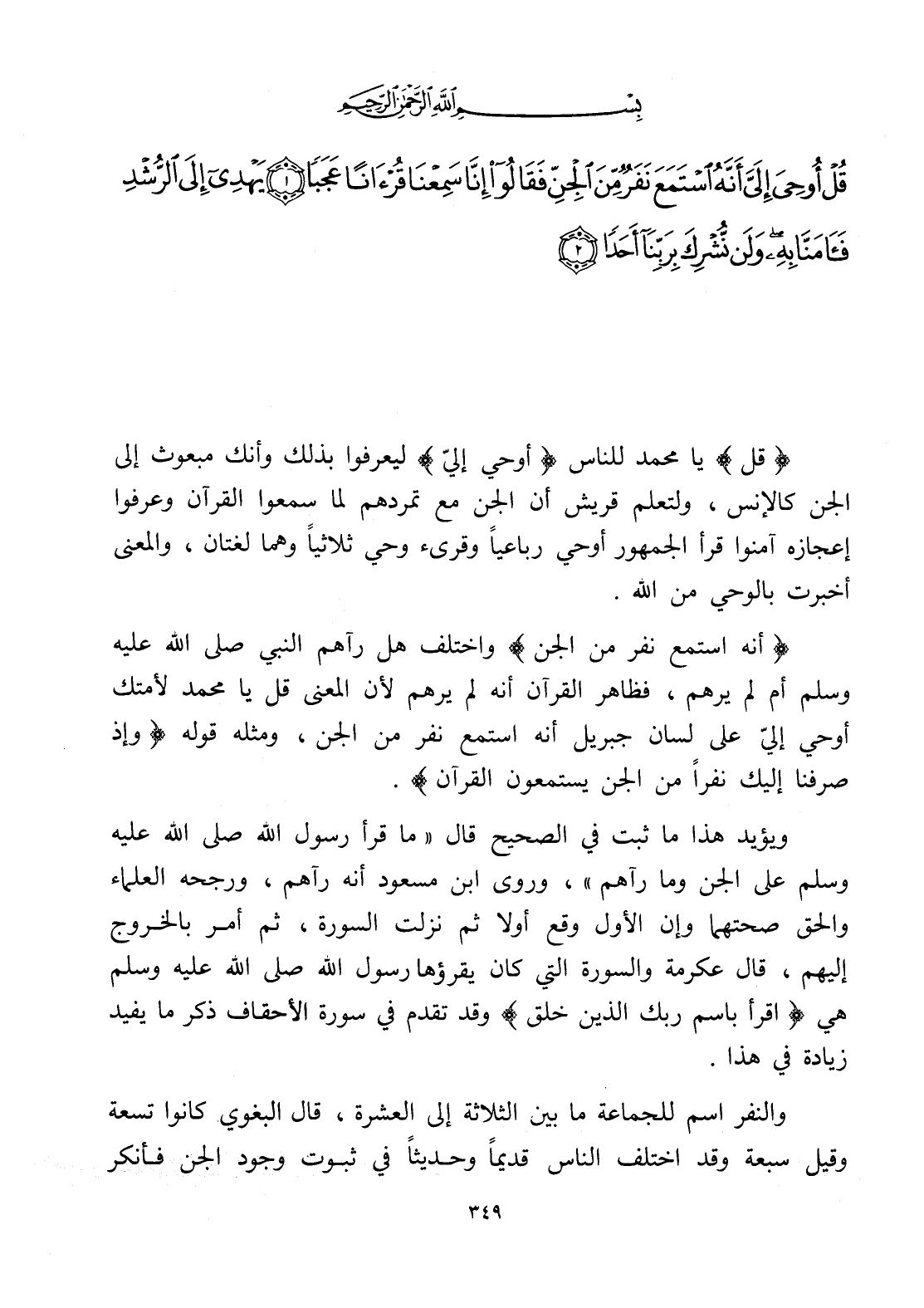 قُلْ أُوحِيَ إِلَيَّ أَنَّهُ اسْتَمَعَ نَفَرٌ مِنَ الْجِنِّ فَقَالُوا إِنَّا سَمِعْنَا قُرْآنًا عَجَبًا (1) يَهْدِي إِلَى الرُّشْدِ فَآمَنَّا بِهِ وَلَنْ نُشْرِكَ بِرَبِّنَا أَحَدًا (2)