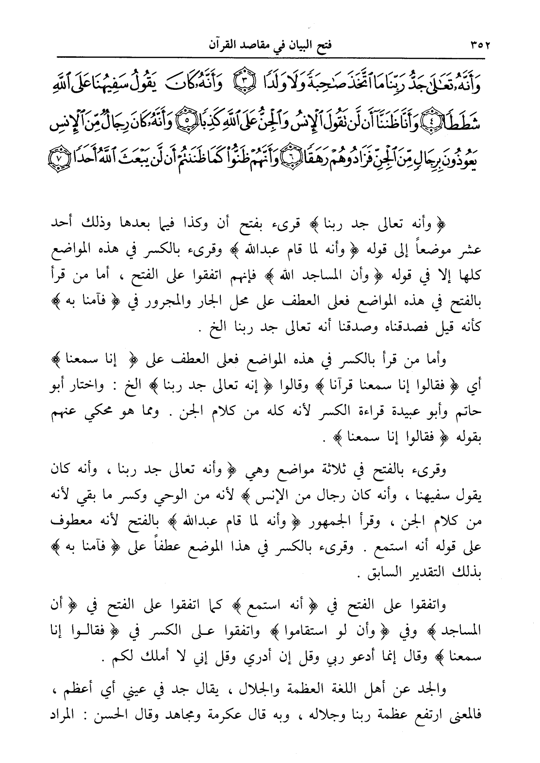 (وأنه تعالى جد ربنا) قرىء بفتح أن وكذا فيما بعدها وذلك أحد عشر موضعاً إلى قوله (وأنه لما قام عبد الله) وقرىء بالكسر في هذه المواضع كلها إلا في قوله (وَأَنَّ الْمَسَاجِدَ لِلَّهِ) فإنهم اتفقوا على الفتح، أما من قرأ بالفتح في هذه المواضع فعلى العطف على محل الجار والمجرور في (فآمنا به) كأنه قيل فصدقناه وصدقنا أنه تعالى جد ربنا الخ.