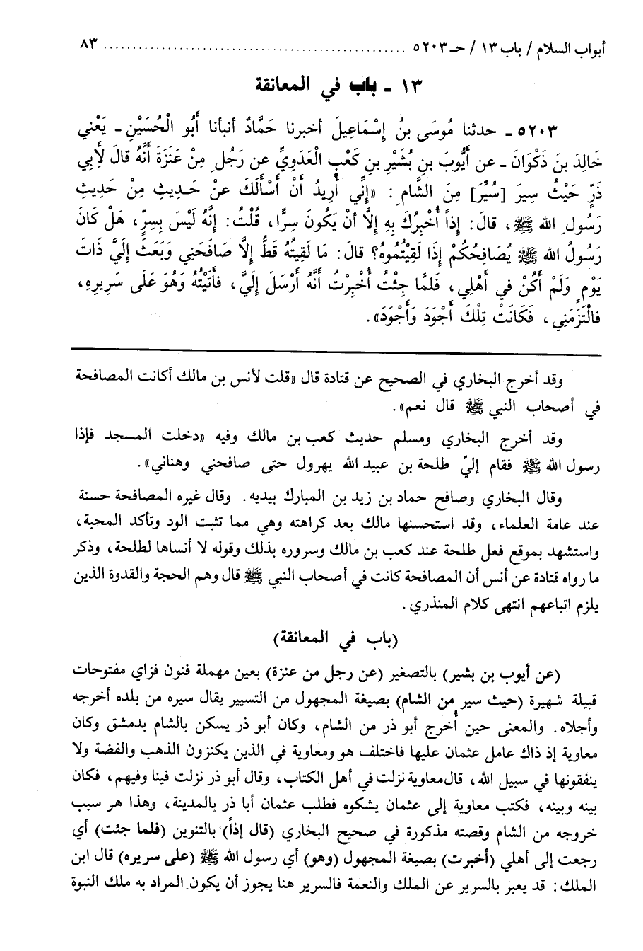وَقَدْ أَخْرَجَ الْبُخَارِيُّ وَمُسْلِمٌ حَدِيثَ كَعْبِ بْنِ مَالِكٍ وَفِيهِ دَخَلْتُ الْمَسْجِدِ فَإِذَا رَسُولُ اللَّهِ صَلَّى اللَّهُ عَلَيْهِ وسلم فقام إِلَيَّ طَلْحَةُ بْنُ عُبَيْدِ اللَّهِ يُهَرْوِلُ حَتَّى صَافَحَنِي وَهَنَّانِي