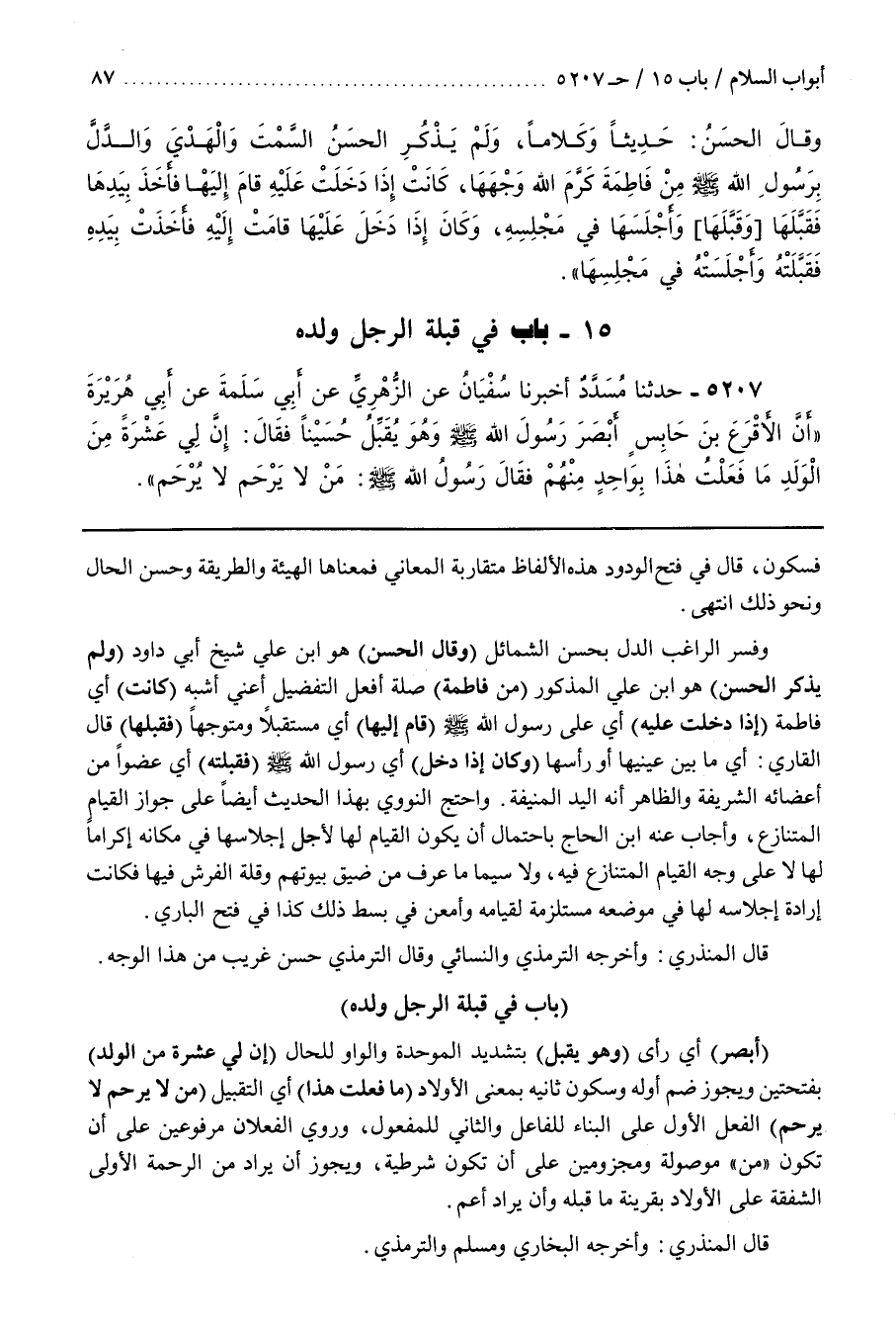 [5218] (أَبْصَرَ) أَيْ رَأَى (وَهُوَ يُقَبِّلُ) بِتَشْدِيدِ الْمُوَحَّدَةِ وَالْوَاوُ لِلْحَالِ (إِنَّ لِي عَشَرَةً مِنَ الْوَلَدِ) بِفَتْحَتَيْنِ وَيَجُوزُ ضَمُّ أَوَّلِهِ وَسُكُونُ ثَانِيهِ بِمَعْنَى الْأَوْلَادِ (مَا فَعَلْتُ هَذَا) أَيِ التَّقْبِيلَ (مَنْ لَا يَرْحَمْ لَا يُرْحَمْ) الْفِعْلُ الْأَوَّلُ عَلَى الْبِنَاءِ لِلْفَاعِلِ وَالثَّانِي لِلْمَفْعُولِ وَرُوِيَ الْفِعْلَانِ مَرْفُوعَيْنِ عَلَى أَنْ تَكُونَ مَنْ مَوْصُولَةً وَمَجْزُومَيْنِ عَلَى أَنْ تَكُونَ شَرْطِيَّةً وَيَجُوزُ أَنْ يُرَادَ مِنَ الرَّحْمَةِ الْأُولَى الشَّفَقَةُ عَلَى الْأَوْلَادِ بِقَرِينَةِ مَا قَبْلَهُ وَأَنْ يُرَادَ أَعَمَّ