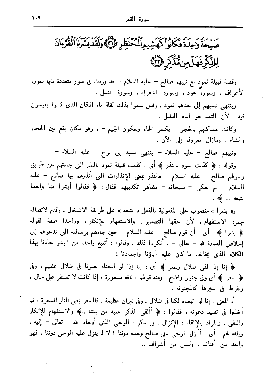 وقوله: كَذَّبَتْ ثَمُودُ بِالنُّذُرِ أى: كذبت قبيلة ثمود بالنذر التي جاءتهم عن طريق رسولهم صالح- عليه السلام- فالنذر بمعنى الإنذارات التي أنذرهم بها صالح- عليه السلام- ثم حكى- سبحانه- مظاهر تكذيبهم فقال: فَقالُوا أَبَشَراً مِنَّا واحِداً نَتَّبِعُهُ....