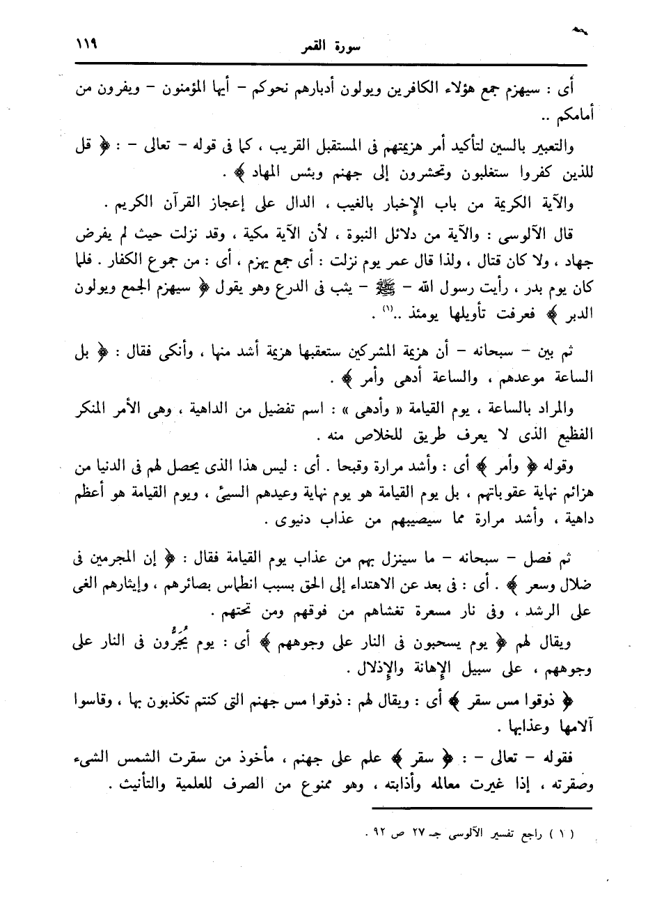 قال الآلوسى: والآية من دلائل النبوة، لأن الآية مكية، وقد نزلت حيث لم يفرض جهاد، ولا كان قتال، ولذا قال عمر يوم نزلت: أى جمع يهزم، أى: من جموع الكفار. فلما كان يوم بدر، رأيت رسول الله صلى الله عليه وسلم يثب في الدرع وهو يقول سَيُهْزَمُ الْجَمْعُ وَيُوَلُّونَ الدُّبُرَ فعرفت تأويلها يومئذ.. «1» .