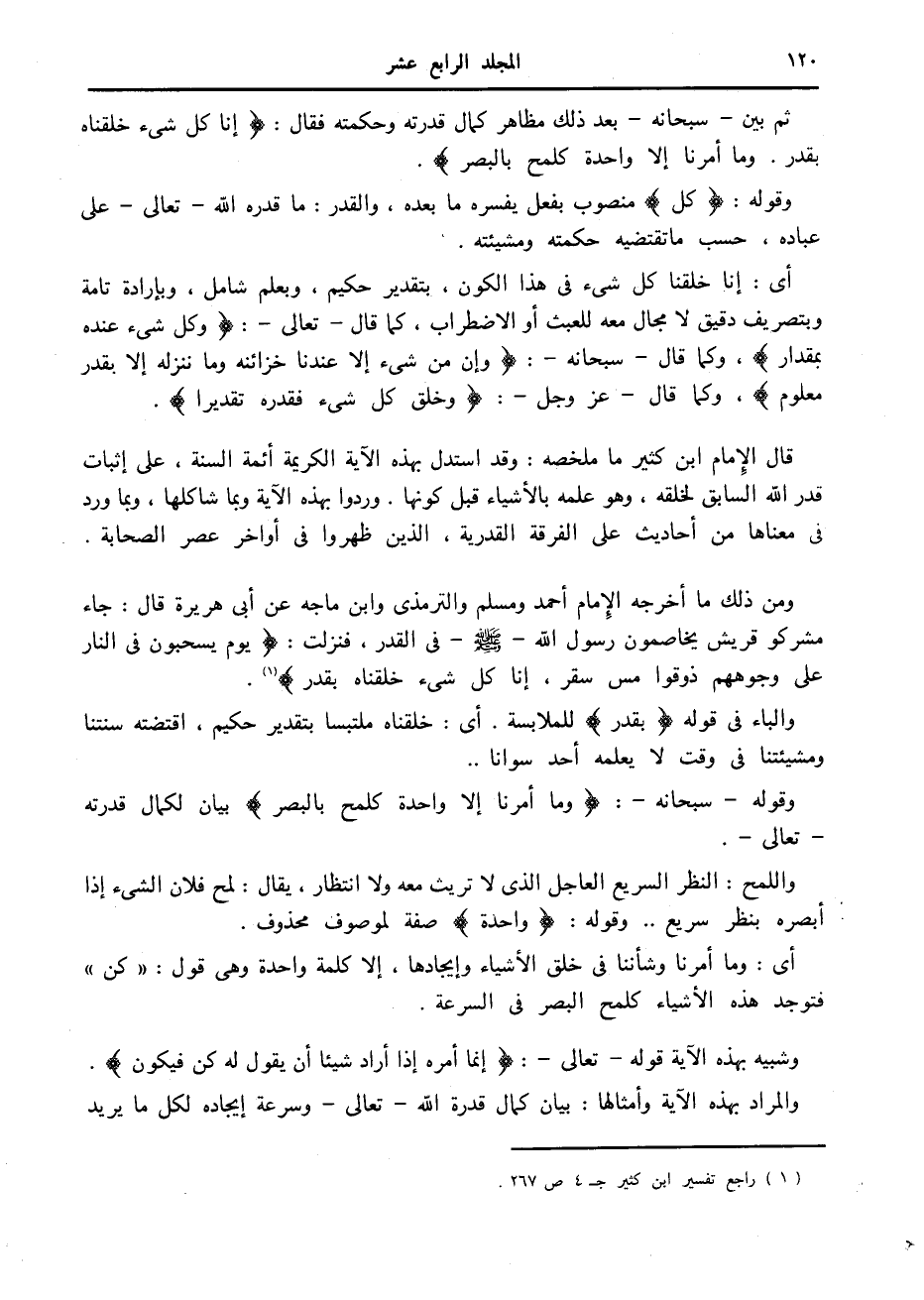 ومن ذلك ما أخرجه الإمام أحمد ومسلم والترمذي وابن ماجة عن أبى هريرة قال: جاء مشركوا قريش يخاصمون رسول الله صلى الله عليه وسلم في القدر، فنزلت: يَوْمَ يُسْحَبُونَ فِي النَّارِ عَلى وُجُوهِهِمْ ذُوقُوا مَسَّ سَقَرَ، إِنَّا كُلَّ شَيْءٍ خَلَقْناهُ بِقَدَرٍ «1» .