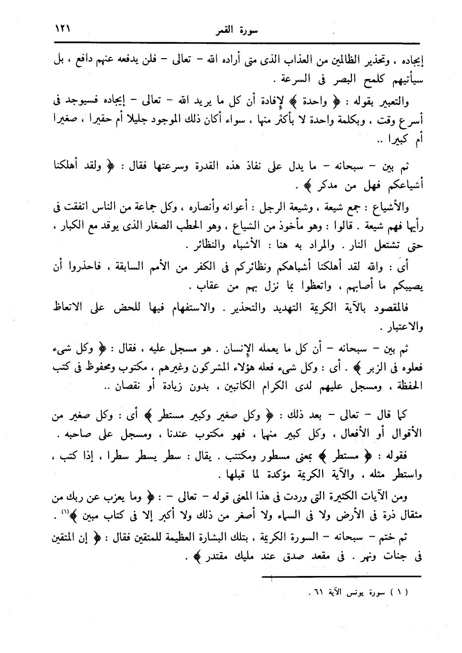 ثم ختم- سبحانه- السورة الكريمة، بتلك البشارة العظيمة للمتقين فقال: إِنَّ الْمُتَّقِينَ فِي جَنَّاتٍ وَنَهَرٍ. فِي مَقْعَدِ صِدْقٍ عِنْدَ مَلِيكٍ مُقْتَدِرٍ.