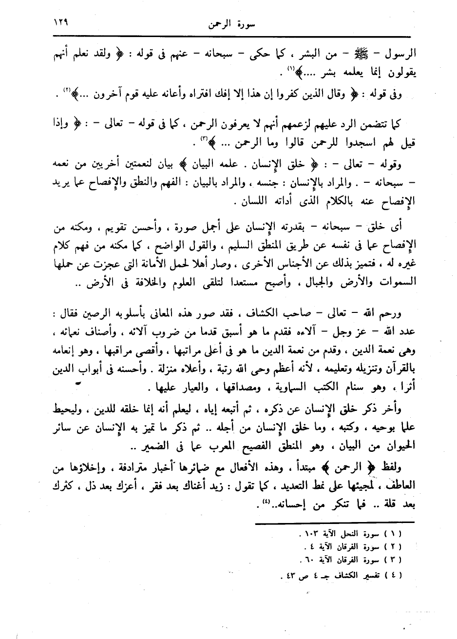 عدد الله- عز وجل- آلاءه فقدم ما هو أسبق قدما من ضروب آلائه، وأصناف نعمائه، وهي نعمة الدين، وقدم من نعمة الدين ما هو في أعلى مراتبها، وأقصى مراقيها، وهو إنعامه بالقرآن وتنزيله وتعليمه، لأنه أعظم وحى الله رتبة، وأعلاه منزلة. وأحسنه في أبواب الدين أثرا، وهو سنام الكتب السماوية، ومصداقها، والعيار عليها.