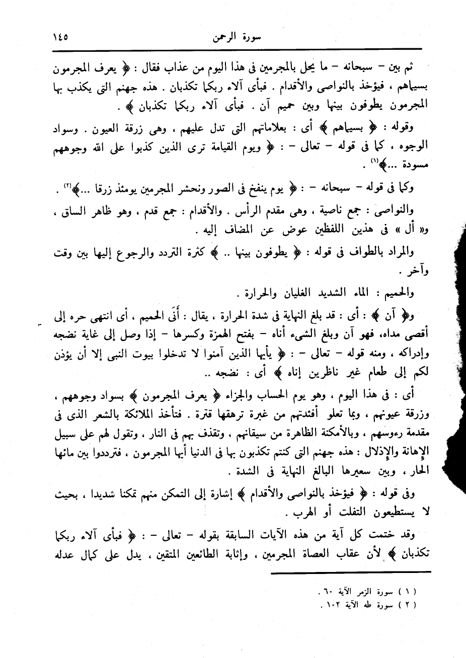 ثم بين- سبحانه- ما يحل بالمجرمين في هذا اليوم من عذاب فقال: يُعْرَفُ الْمُجْرِمُونَ بِسِيماهُمْ، فَيُؤْخَذُ بِالنَّواصِي وَالْأَقْدامِ. فَبِأَيِّ آلاءِ رَبِّكُما تُكَذِّبانِ. هذِهِ جَهَنَّمُ الَّتِي يُكَذِّبُ بِهَا الْمُجْرِمُونَ يَطُوفُونَ بَيْنَها وَبَيْنَ حَمِيمٍ آنٍ. فَبِأَيِّ آلاءِ رَبِّكُما تُكَذِّبانِ.