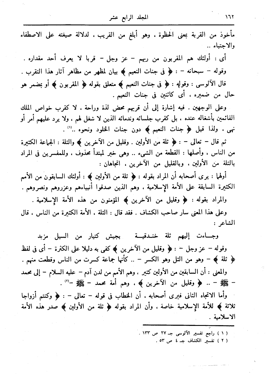 وقوله- عز وجل-: وَقَلِيلٌ مِنَ الْآخِرِينَ كفى به دليلا على الكثرة- أى في لفظ ثُلَّةٌ- وهو من الثل وهو الكسر-.. كأنها جماعة كسرت من الناس وقطعت منهم.
