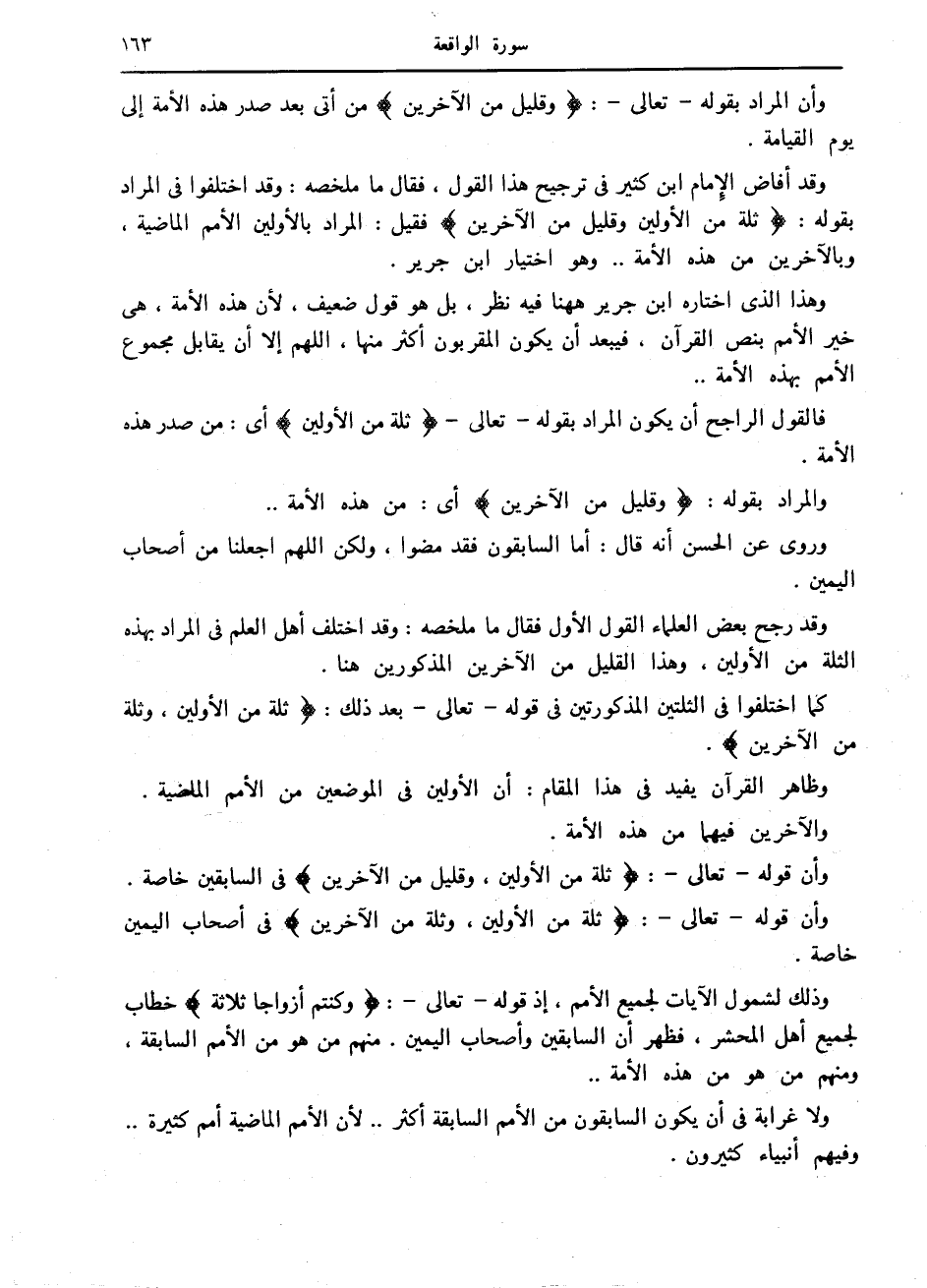 وقد أفاض الإمام ابن كثير في ترجيح هذا القول، فقال ما ملخصه: وقد اختلفوا في المراد بقوله: ثُلَّةٌ مِنَ الْأَوَّلِينَ وَقَلِيلٌ مِنَ الْآخِرِينَ فقيل: المراد بالأولين الأمم الماضية، وبالآخرين من هذه الأمة.. وهو اختيار ابن جرير.