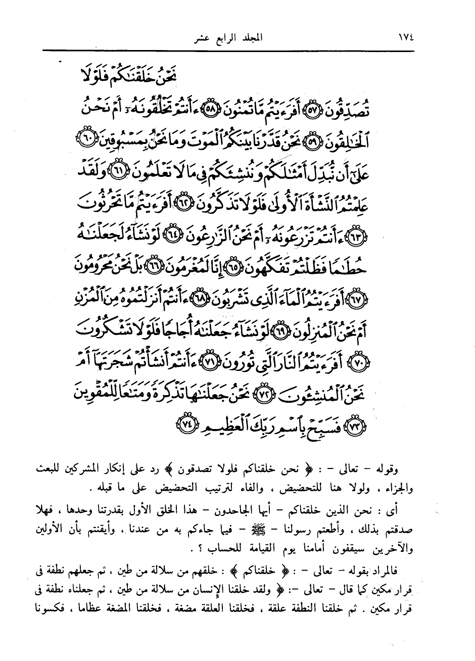 نَحْنُ خَلَقْناكُمْ فَلَوْلا تُصَدِّقُونَ (57) أَفَرَأَيْتُمْ ما تُمْنُونَ (58) أَأَنْتُمْ تَخْلُقُونَهُ أَمْ نَحْنُ الْخالِقُونَ (59) نَحْنُ قَدَّرْنا بَيْنَكُمُ الْمَوْتَ وَما نَحْنُ بِمَسْبُوقِينَ (60) عَلى أَنْ نُبَدِّلَ أَمْثالَكُمْ وَنُنْشِئَكُمْ فِي ما لا تَعْلَمُونَ (61)