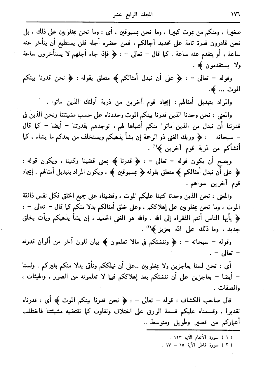 والمعنى: نحن وحدنا الذين قدرنا بينكم الموت وحددناه على حسب مشيئتنا ونحن الذين في قدرتنا أن نبدل من الذين ماتوا منكم أشباها لهم، نوجدهم بقدرتنا- أيضا- كما قال- سبحانه-: وَرَبُّكَ الْغَنِيُّ ذُو الرَّحْمَةِ إِنْ يَشَأْ يُذْهِبْكُمْ وَيَسْتَخْلِفْ مِنْ بَعْدِكُمْ ما يَشاءُ، كَما أَنْشَأَكُمْ مِنْ ذُرِّيَّةِ قَوْمٍ آخَرِينَ «1» .