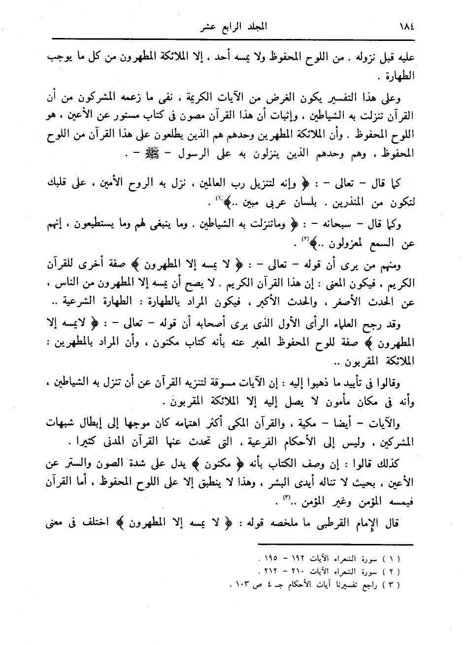 وقالوا في تأييد ما ذهبوا إليه: إن الآيات مسوقة لتنزيه القرآن عن أن تنزل به الشياطين، وأنه في مكان مأمون لا يصل إليه إلا الملائكة المقربون.