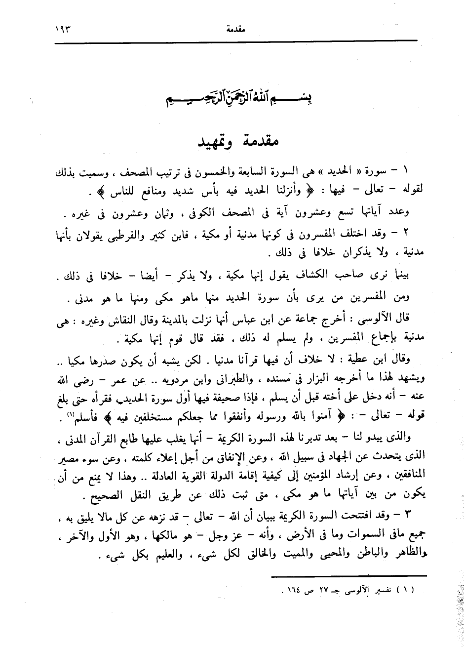 1- سورة «الحديد» هي السورة السابعة والخمسون في ترتيب المصحف، وسميت بذلك لقوله- تعالى- فيها: وَأَنْزَلْنَا الْحَدِيدَ فِيهِ بَأْسٌ شَدِيدٌ وَمَنافِعُ لِلنَّاسِ.