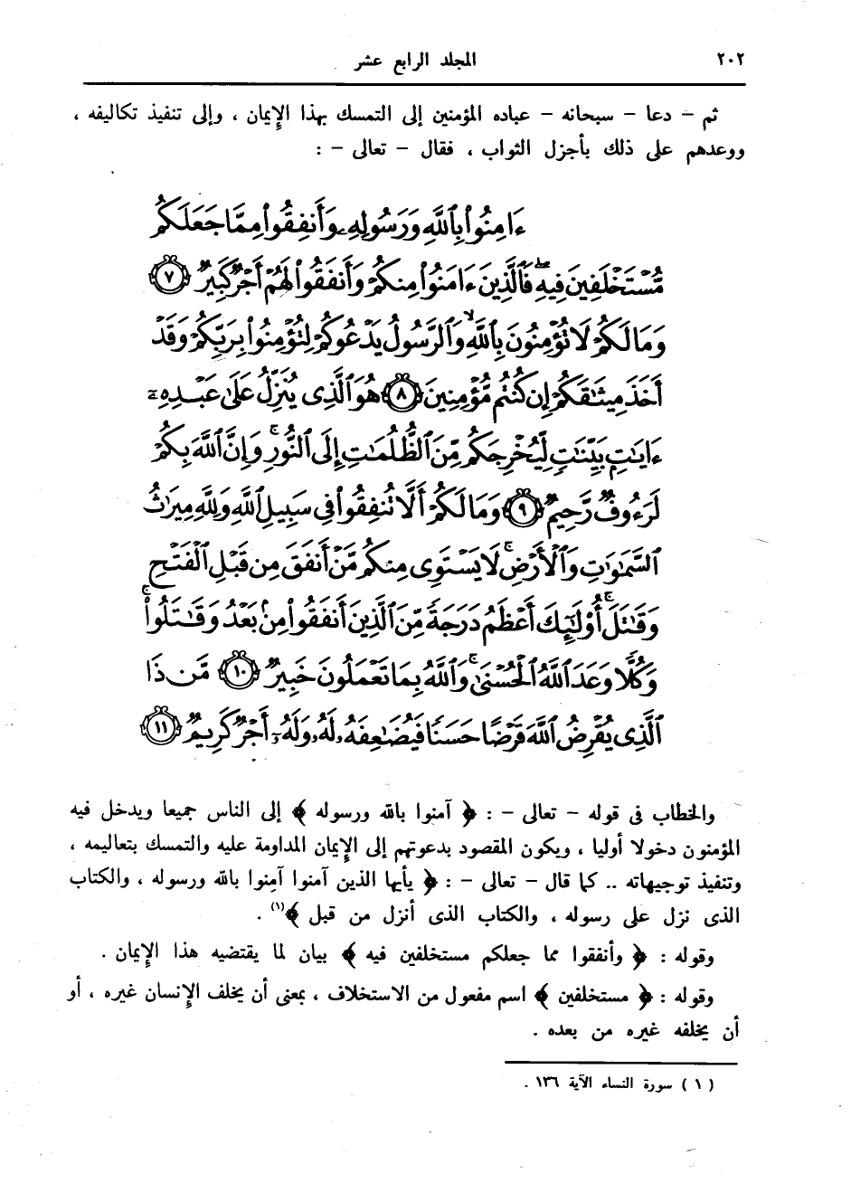 آمِنُوا بِاللَّهِ وَرَسُولِهِ وَأَنْفِقُوا مِمَّا جَعَلَكُمْ مُسْتَخْلَفِينَ فِيهِ فَالَّذِينَ آمَنُوا مِنْكُمْ وَأَنْفَقُوا لَهُمْ أَجْرٌ كَبِيرٌ (7) وَما لَكُمْ لا تُؤْمِنُونَ بِاللَّهِ وَالرَّسُولُ يَدْعُوكُمْ لِتُؤْمِنُوا بِرَبِّكُمْ وَقَدْ أَخَذَ مِيثاقَكُمْ إِنْ كُنْتُمْ مُؤْمِنِينَ (8) هُوَ الَّذِي يُنَزِّلُ عَلى عَبْدِهِ آياتٍ بَيِّناتٍ لِيُخْرِجَكُمْ مِنَ الظُّلُماتِ إِلَى النُّورِ وَإِنَّ اللَّهَ بِكُمْ لَرَؤُفٌ رَحِيمٌ (9) وَما لَكُمْ أَلاَّ تُنْفِقُوا فِي سَبِيلِ اللَّهِ وَلِلَّهِ مِيراثُ السَّماواتِ وَالْأَرْضِ لا يَسْتَوِي مِنْكُمْ مَنْ أَنْفَقَ مِنْ قَبْلِ الْفَتْحِ وَقاتَلَ أُولئِكَ أَعْظَمُ دَرَجَةً مِنَ الَّذِينَ أَنْفَقُوا مِنْ بَعْدُ وَقاتَلُوا وَكُلاًّ وَعَدَ اللَّهُ الْحُسْنى وَاللَّهُ بِما تَعْمَلُونَ خَبِيرٌ (10) مَنْ ذَا الَّذِي يُقْرِضُ اللَّهَ قَرْضاً حَسَناً فَيُضاعِفَهُ لَهُ وَلَهُ أَجْرٌ كَرِيمٌ (11)
