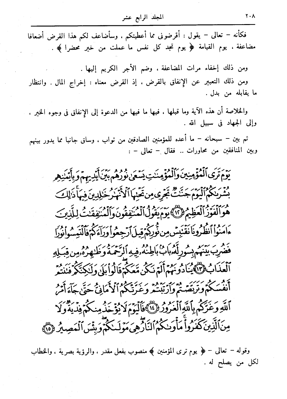 ثم بين- سبحانه- ما أعده للمؤمنين الصادقين من ثواب، وساق جانبا مما يدور بينهم وبين المنافقين من محاورات.. فقال- تعالى-: