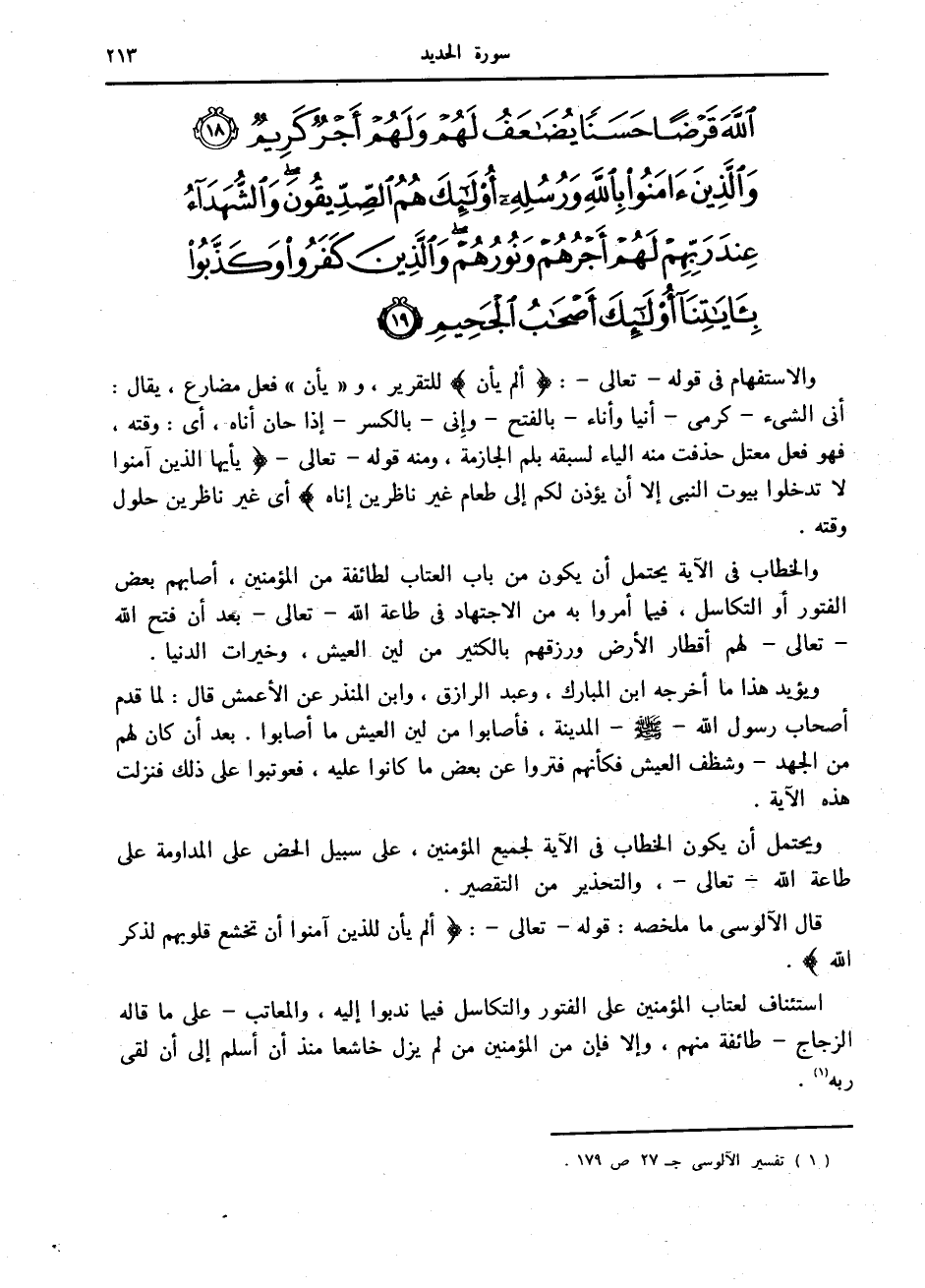 قال الآلوسى ما ملخصه: قوله- تعالى-: أَلَمْ يَأْنِ لِلَّذِينَ آمَنُوا أَنْ تَخْشَعَ قُلُوبُهُمْ لِذِكْرِ اللَّهِ.