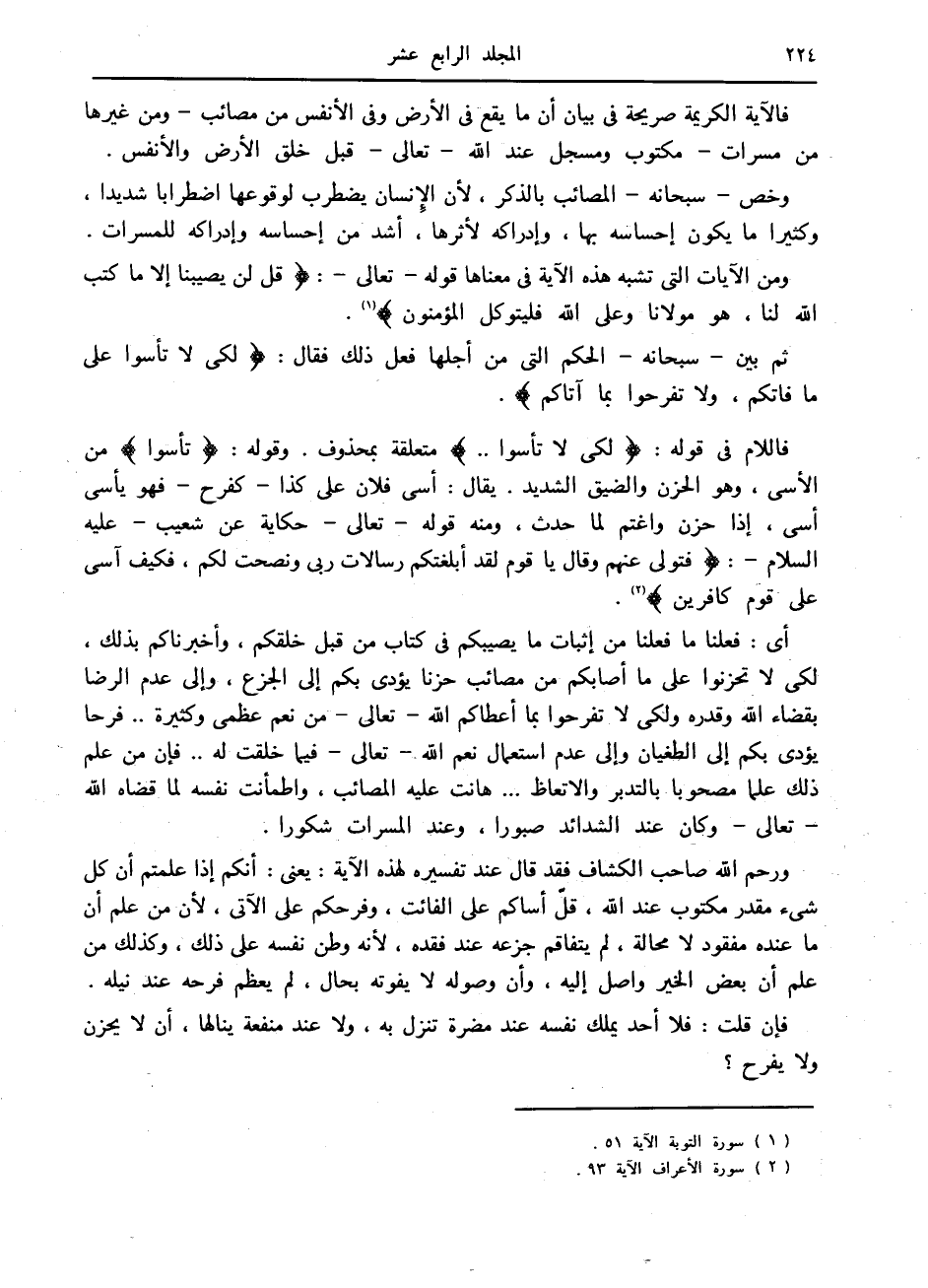 ورحم الله صاحب الكشاف فقد قال عند تفسيره لهذه الآية: يعنى: أنكم إذا علمتم أن كل شيء مقدر مكتوب عند الله، قلّ أساكم على الفائت، وفرحكم على الآتي، لأن من علم أن ما عنده مفقود لا محالة، لم يتفاقم جزعه عند فقده، لأنه وطن نفسه على ذلك، وكذلك من علم أن بعض الخير واصل إليه، وأن وصوله لا يفوته بحال، لم يعظم فرحه عند نيله.