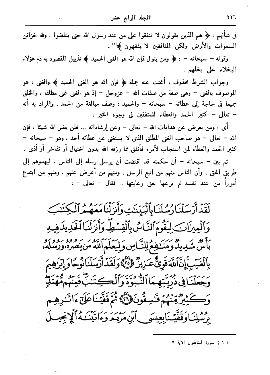 وجواب الشرط محذوف، أغنت عنه جملة فَإِنَّ اللَّهَ هُوَ الْغَنِيُّ الْحَمِيدُ والغنى: هو الموصوف بالغنى- وهي صفة من صفات الله- عز وجل- إذ هو الغنى غنى مطلقا، والخلق جميعا في حاجة إلى عطائه- سبحانه- والحميد: وصف مبالغة من الحمد. والمراد به أنه- تعالى- كثير الحمد والعطاء للمنفقين في وجوه الخير.