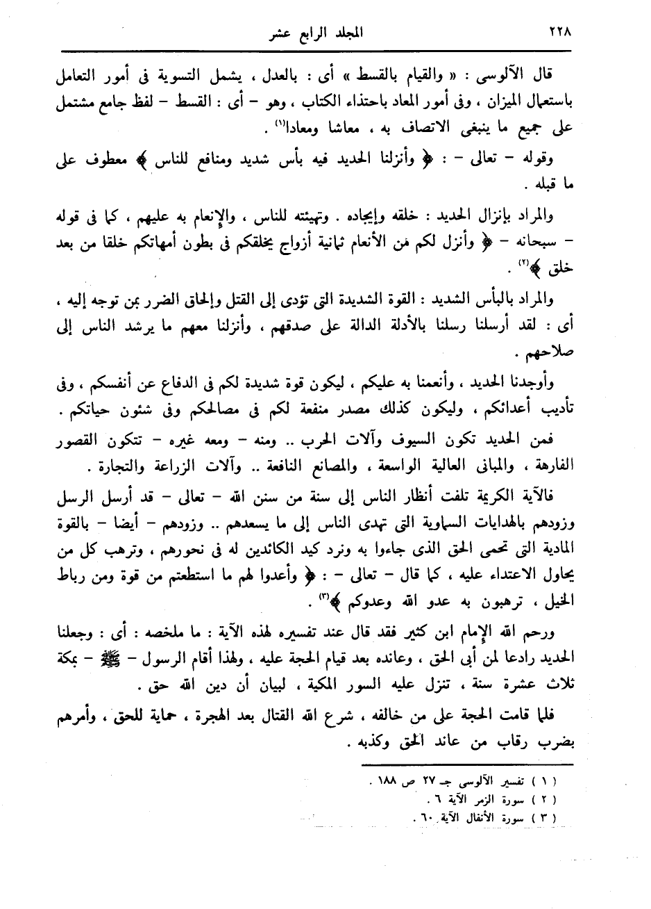 ورحم الله الإمام ابن كثير فقد قال عند تفسيره لهذه الآية: ما ملخصه: أى: وجعلنا الحديد رادعا لمن أبى الحق، وعانده بعد قيام الحجة عليه، ولهذا أقام الرسول صلى الله عليه وسلم بمكة ثلاث عشرة سنة، تنزل عليه السور المكية، لبيان أن دين الله حق.