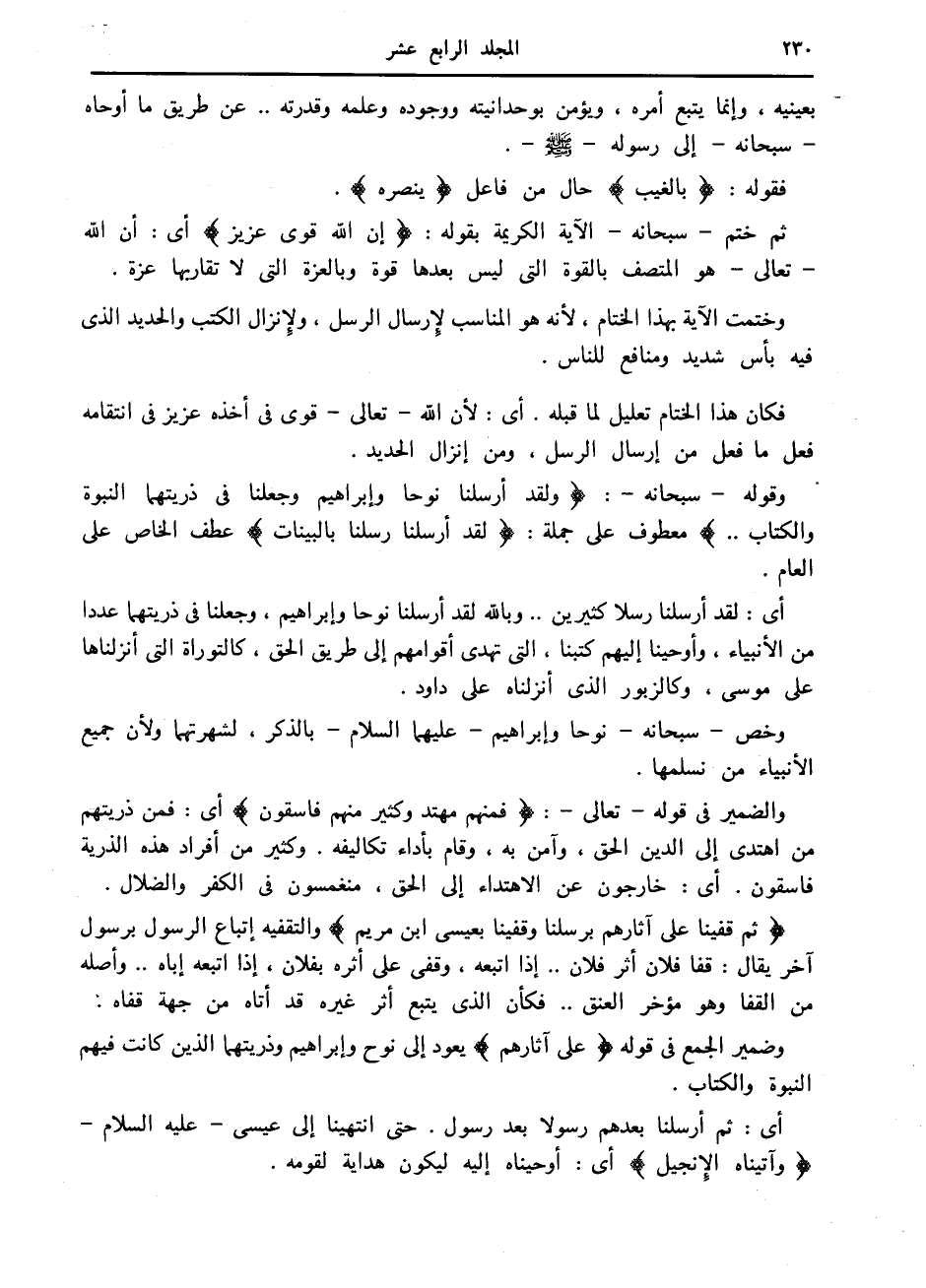 وقوله- سبحانه-: وَلَقَدْ أَرْسَلْنا نُوحاً وَإِبْراهِيمَ وَجَعَلْنا فِي ذُرِّيَّتِهِمَا النُّبُوَّةَ وَالْكِتابَ.. معطوف على جملة: لَقَدْ أَرْسَلْنا رُسُلَنا بِالْبَيِّناتِ عطف الخاص على العام.