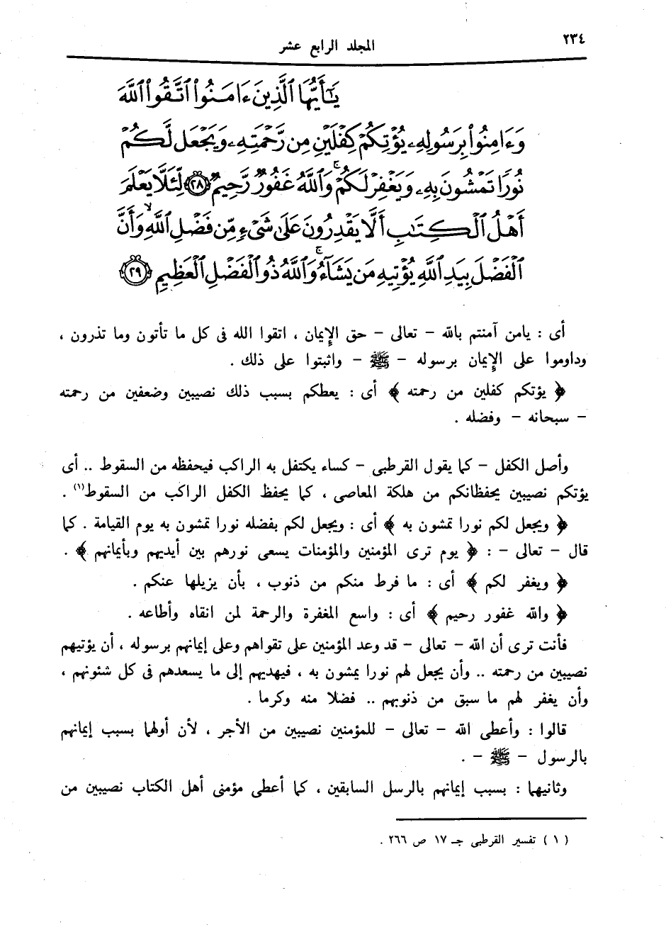 يا أَيُّهَا الَّذِينَ آمَنُوا اتَّقُوا اللَّهَ وَآمِنُوا بِرَسُولِهِ يُؤْتِكُمْ كِفْلَيْنِ مِنْ رَحْمَتِهِ وَيَجْعَلْ لَكُمْ نُوراً تَمْشُونَ بِهِ وَيَغْفِرْ لَكُمْ وَاللَّهُ غَفُورٌ رَحِيمٌ (28) لِئَلاَّ يَعْلَمَ أَهْلُ الْكِتابِ أَلاَّ يَقْدِرُونَ عَلى شَيْءٍ مِنْ فَضْلِ اللَّهِ وَأَنَّ الْفَضْلَ بِيَدِ اللَّهِ يُؤْتِيهِ مَنْ يَشاءُ وَاللَّهُ ذُو الْفَضْلِ الْعَظِيمِ (29)