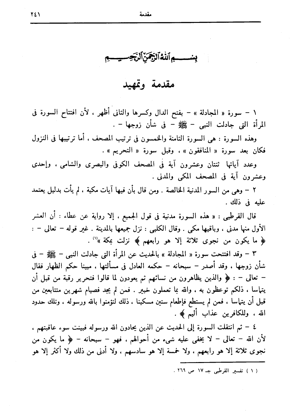 1- سورة «المجادلة» - بفتح الدال وكسرها والثاني أظهر، لأن افتتاح السورة في المرأة التي جادلت النبي صلى الله عليه وسلم في شأن زوجها-.