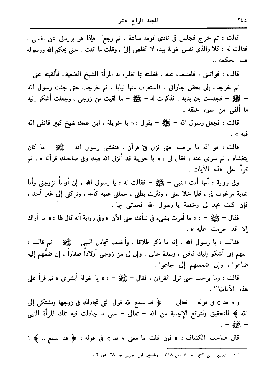 قالت: فو الله ما برحت حتى نزل فىّ قرآن، فتغشى رسول الله صلى الله عليه وسلم ما كان يتغشاه، ثم سرى عنه، فقال لي: «يا خويلة قد أنزل الله فيك وفي صاحبك قرآنا» . ثم قرأ على هذه الآيات.