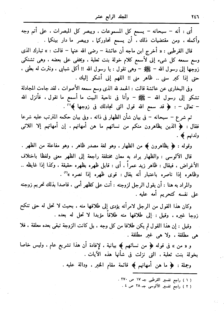 قال القرطبي: «أخرج ابن ماجة أن عائشة- رضى الله عنها- قالت: تبارك الذي وسع سمعه كل شيء إنى لأسمع كلام خولة بنت ثعلبة، ويخفى على بعضه، وهي تشتكي زوجها إلى رسول الله صلى الله عليه وسلم وهي تقول: يا رسول الله!! أكل شبابي، ونثرت له بطني، حتى إذا كبر سنى.. ظاهر منى!! اللهم إنى أشكو إليك.
