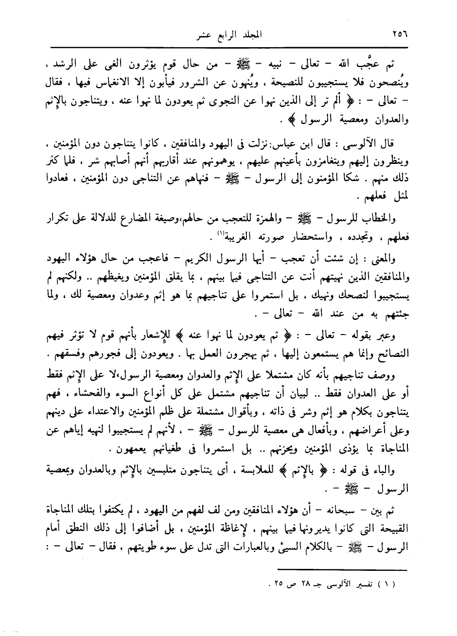 ثم عجّب الله- تعالى- نبيه صلى الله عليه وسلم من حال قوم يؤثرون الغي على الرشد، وينصحون فلا يستجيبون للنصيحة، وينهون عن الشرور فيأبون إلا الانغماس فيها، فقال- تعالى-: أَلَمْ تَرَ إِلَى الَّذِينَ نُهُوا عَنِ النَّجْوى ثُمَّ يَعُودُونَ لِما نُهُوا عَنْهُ، وَيَتَناجَوْنَ بِالْإِثْمِ وَالْعُدْوانِ وَمَعْصِيَةِ الرَّسُولِ.