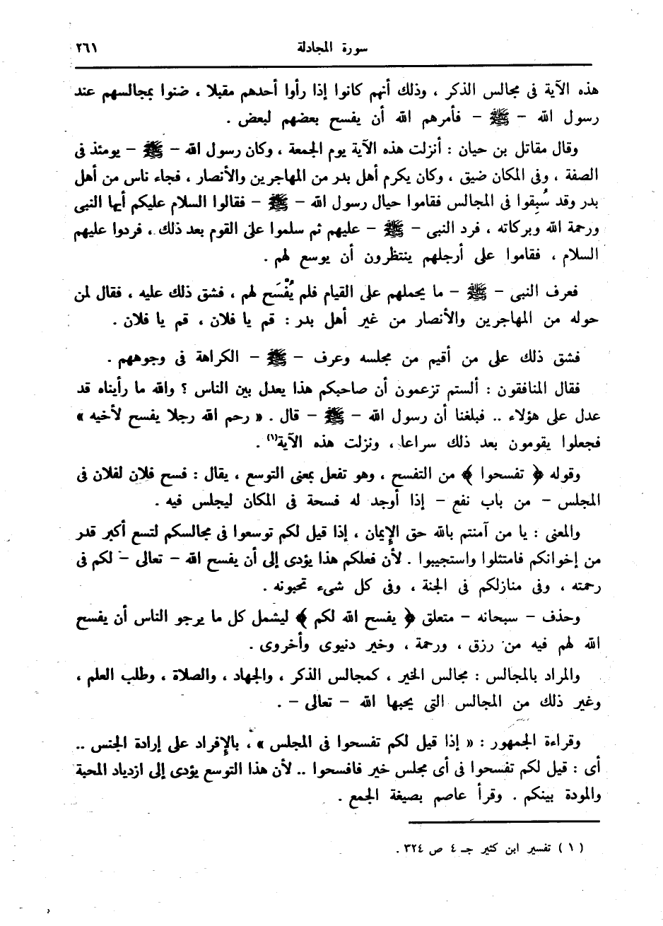 فقال المنافقون: ألستم تزعمون أن صاحبكم هذا يعدل بين الناس؟ والله ما رأيناه قد عدل على هؤلاء.. فبلغنا أن رسول الله صلى الله عليه وسلم قال: «رحم الله رجلا يفسح لأخيه» فجعلوا يقومون بعد ذلك سراعا، ونزلت هذه الآية «1» .